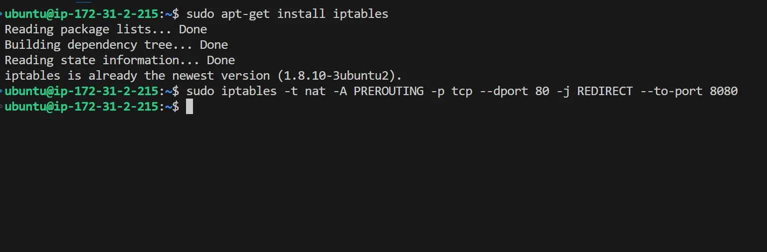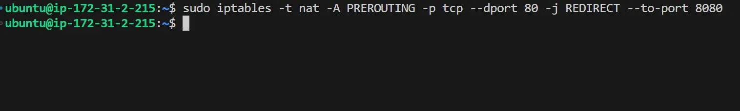 sudo iptables -t nat -A PREROUTING -p tcp --dport 80 -j REDIRECT --to-port 8080