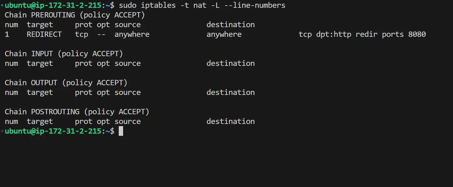 sudo iptables -t nat -L --line-numbers
