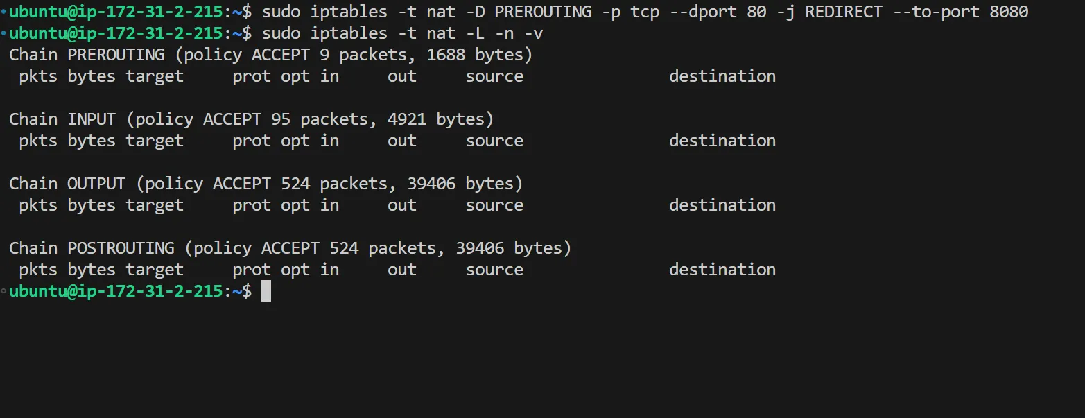 sudo iptables -t nat -D PREROUTING -p tcp --dport 80 -j REDIRECT --to-port 8080