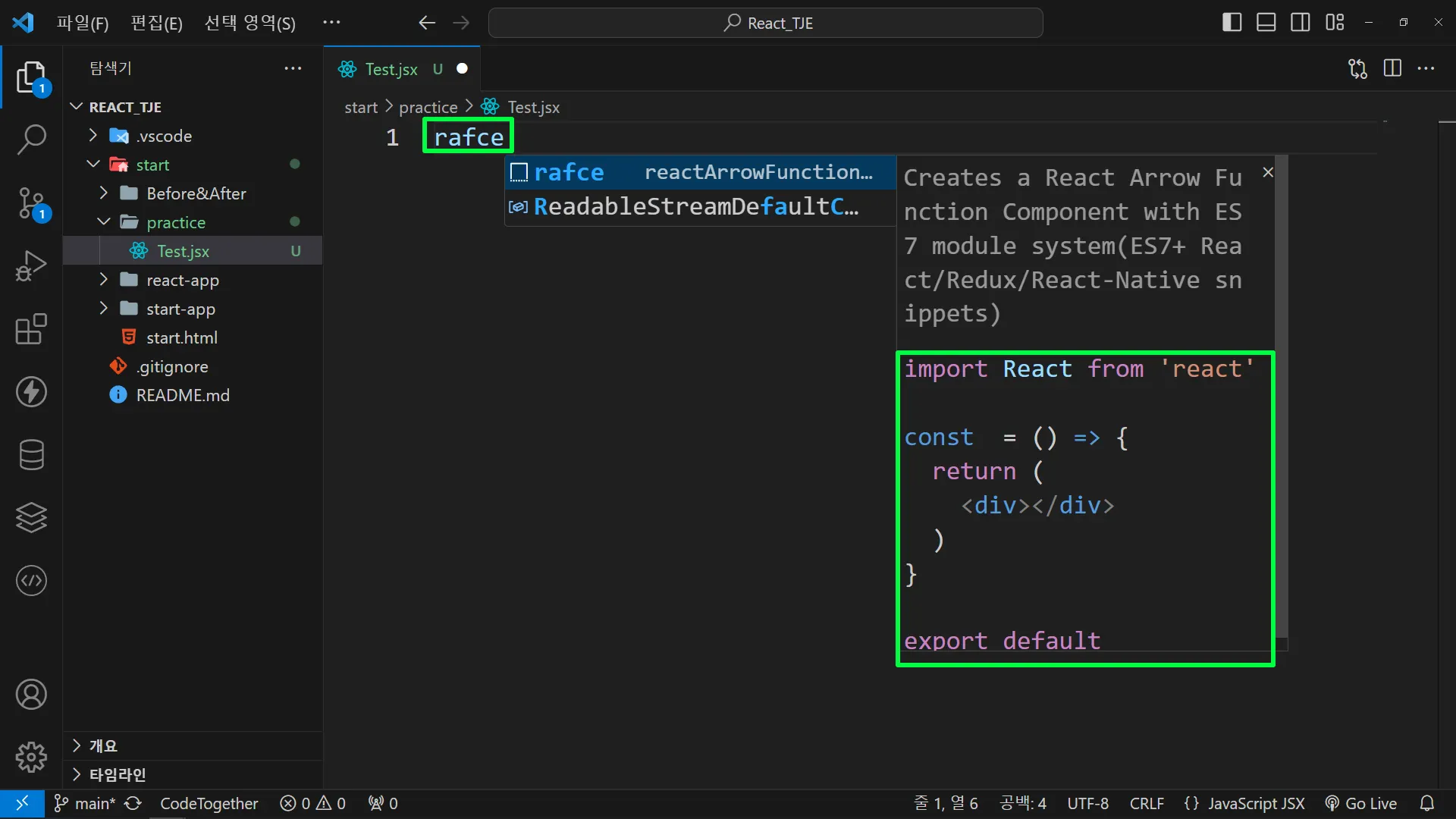 λ ₯νκ³ Tab ν€λ₯Ό λλ₯΄λ©΄ ν¨μν React μ»΄ν¬λνΈμ κΈ°λ³Έ κ΅¬μ‘°κ° μμ±λ©λλ€. κ°μ λ°©μμΌλ‘ λ€μν μ€λν«μ μ¬μ©ν μ μμ΅λλ€. νμ₯μ λ¬Έμλ₯Ό νμΈνλ©΄ μ§μνλ μ€λν« λͺ©λ‘κ³Ό μ¬μ©λ²μ μ°Ύμ μ μμ΅λλ€.