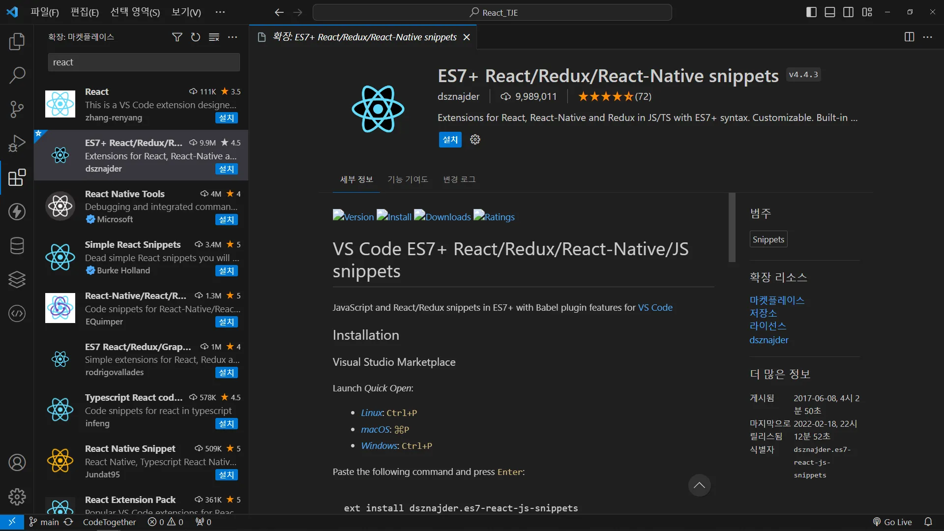 κ²μ κ²°κ³Όμμ "ES7+ React/Redux/React-Native snippets"μ μ°Ύκ³ , μ€μΉ λ²νΌμ ν΄λ¦νμ¬ νμ₯μ μ€μΉν©λλ€.