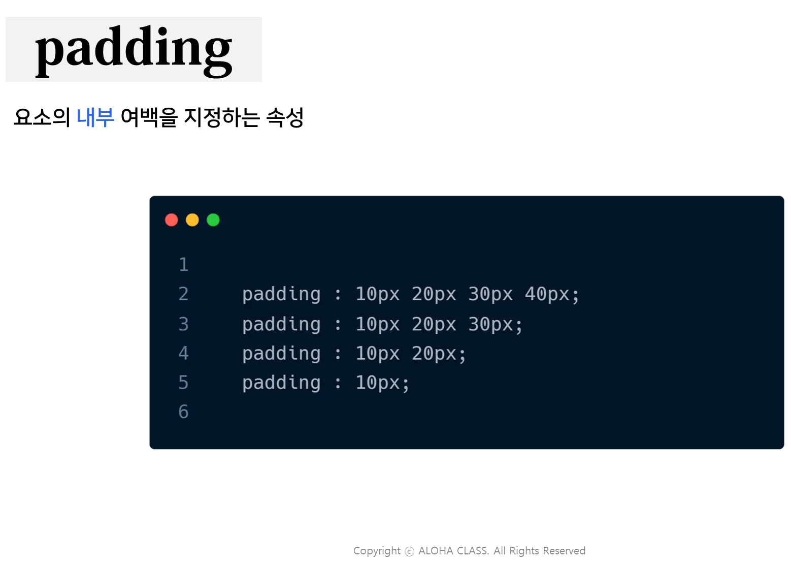 μμ: padding: 10px 20px 30px 40px; β μ 10px, μ° 20px, ν 30px, μ’ 40px.