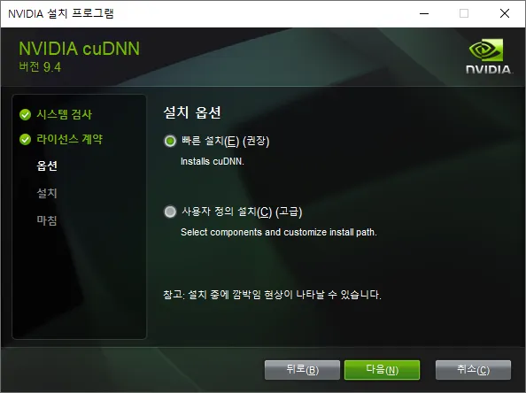 cuDNN 9.4 ํ์ผ์ด ์ด๋ฏธ ์ค์น๋ ๊ฒฝ์ฐ, ์ค์น๋ ๊ฒฝ๋ก๋ฅผ ํ์ธํ์ธ์. ๋ณดํต cuDNN ์ค์น ํ์ผ์๋ bin, include, lib ๋๋ ํ ๋ฆฌ๊ฐ ์์ต๋๋ค.