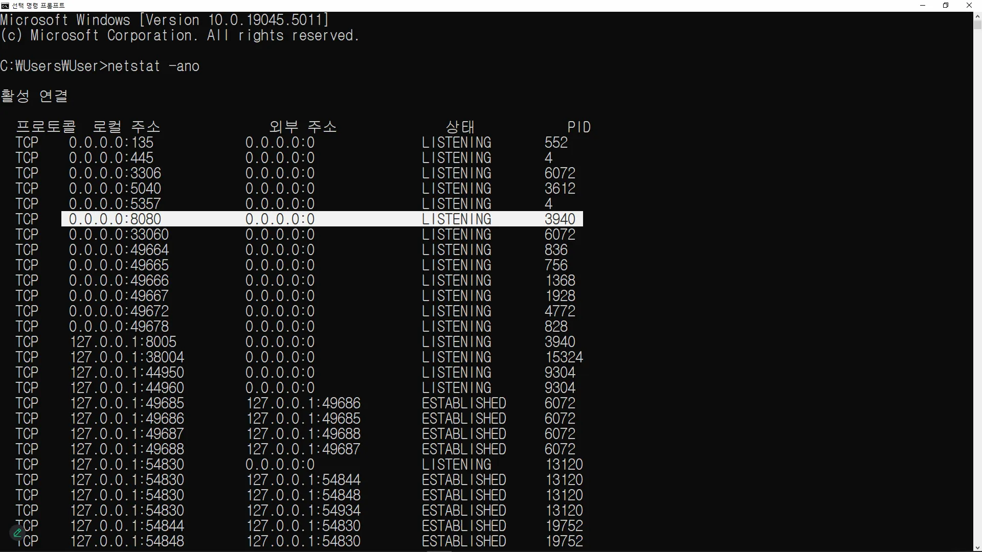 8080 ํฌํธ๋ฅผ ์ฌ์ฉ ์ค์ธ ํ๋ก์ธ์ค ID ์ฐพ๊ธฐ(PID)