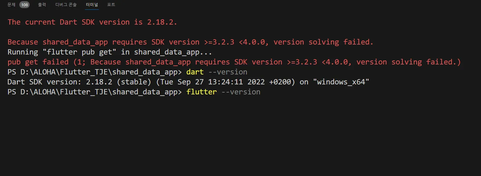 shared_data_app ๋ผ์ด๋ธ๋ฌ๋ฆฌ ๋ฒ์ ์ด, SDK version >=3.2.3 <4.0.0 ๋ฒ์ ์ ์๊ตฌํ๊ณ ์๋๋ฐ, ํ์ฌ Dart ๋ฒ์ ์ 2.18.2. ์ด๋ผ์ ์๊ตฌ์ฌํญ์ ๋ฒ์ ์ ์ถฉ์กฑํ์ง ๋ชปํ๋ค.