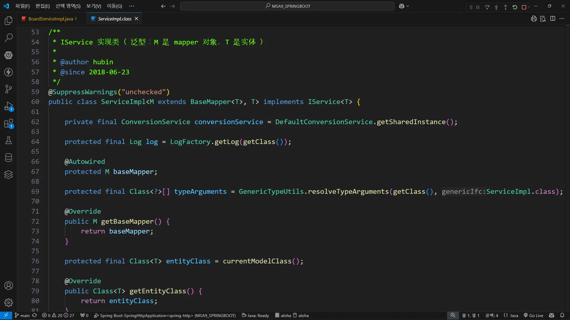 MyBatis Plus ์์ ์ ๊ณตํ๋ ServiceImpl<M extends BaseMapper<T>, T> ํด๋์ค์