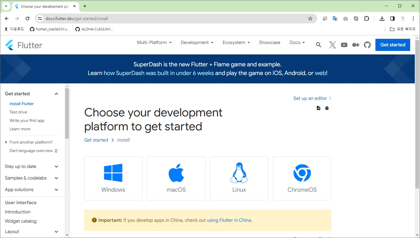 Flutter 공식사이트 다운로드 링크를 클릭합니다. 그리고 운영체제(OS)를 선택합니다.