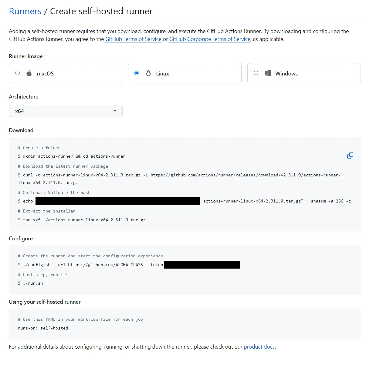 $ ./config.sh --url https://github.com/ALOHA-CLASS --token ???????????????????????? Last step, run it!