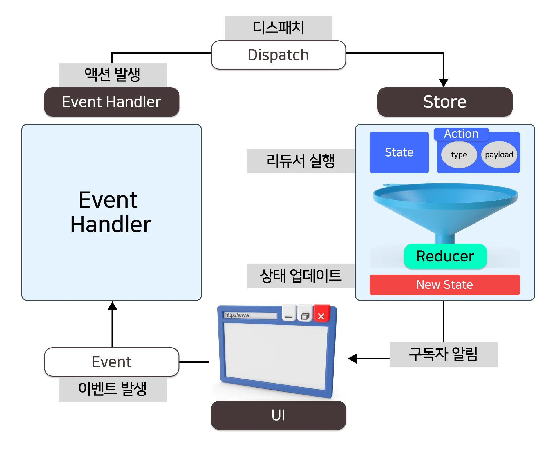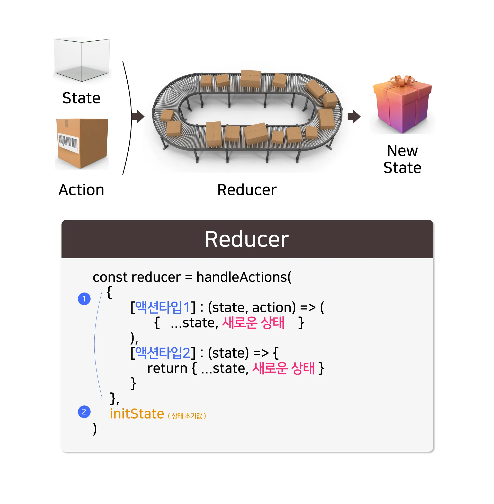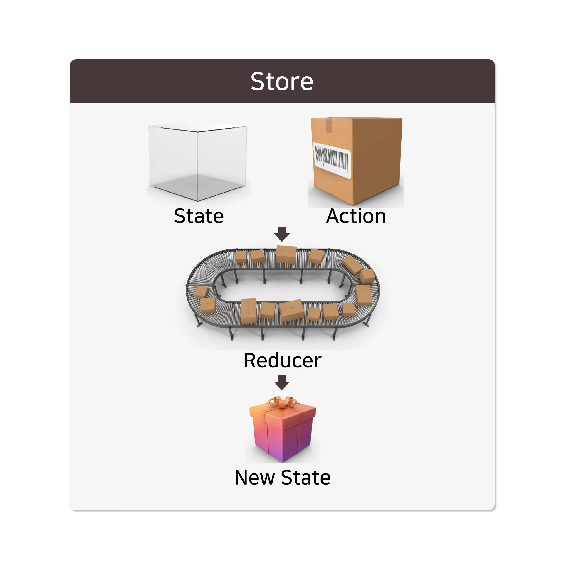 λ ₯λ°μ μλ‘μ΄ μνλ₯Ό λ°ννλ μμ ν¨μμΈ λ¦¬λμ(reducer)λ₯Ό ν΅ν΄ μνκ° λ³κ²½λ©λλ€.