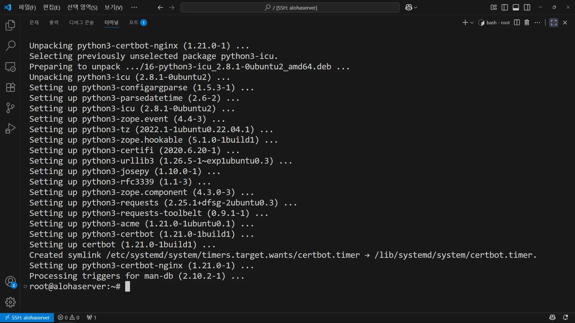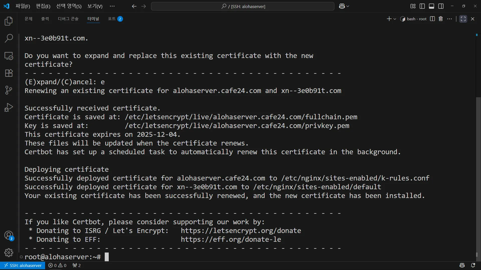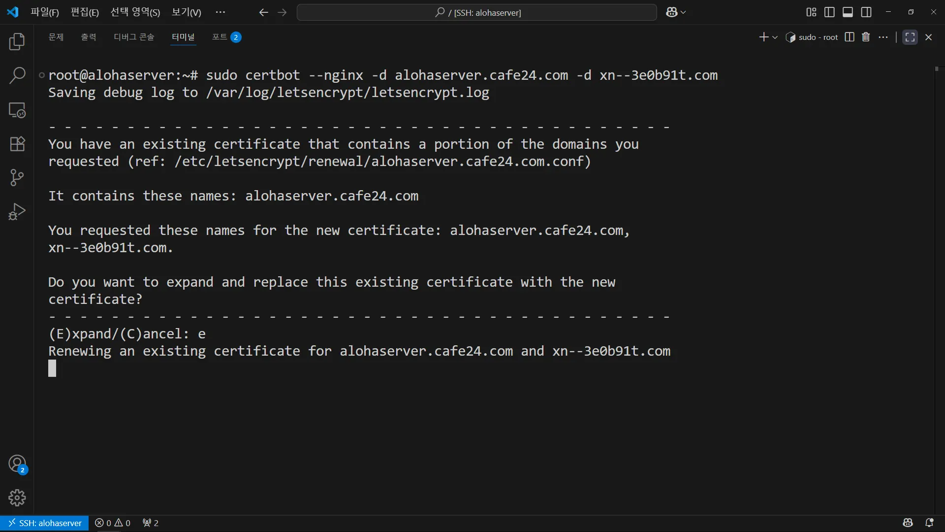 sudo certbot --nginx -d alohaserver.cafe24.com -d xn--3e0b91t.com