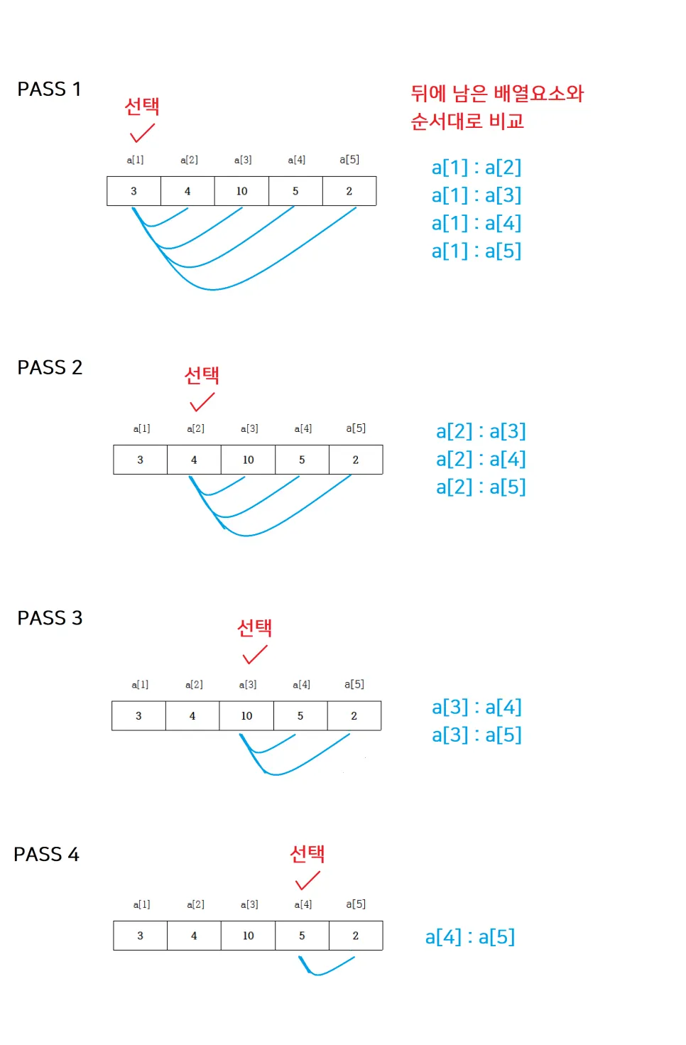 A["์์: [5, 3, 8, 4, 2]"] --> B["1ํ์ : ์ต์๊ฐ 2 ์ฐพ๊ธฐ"]