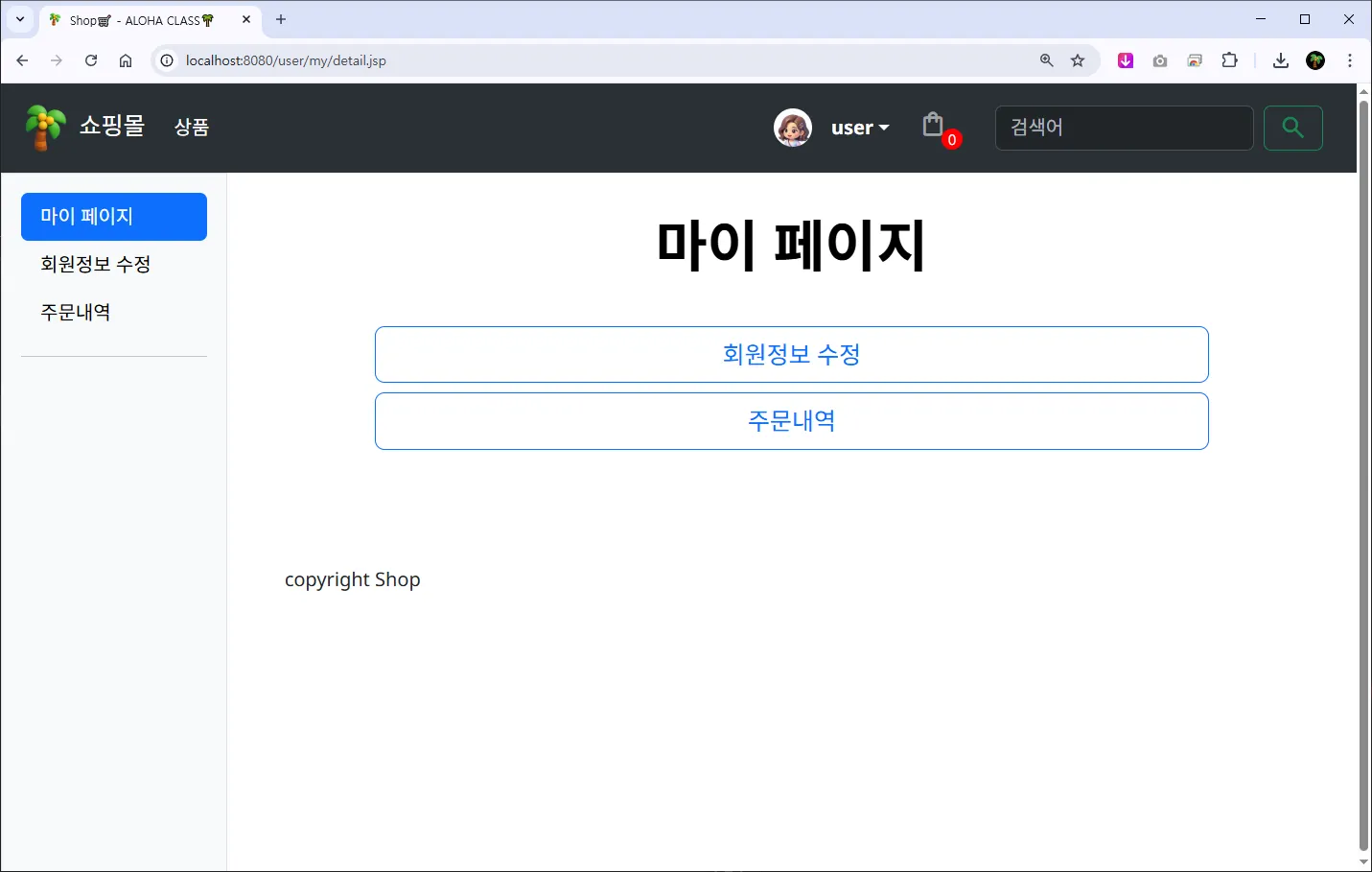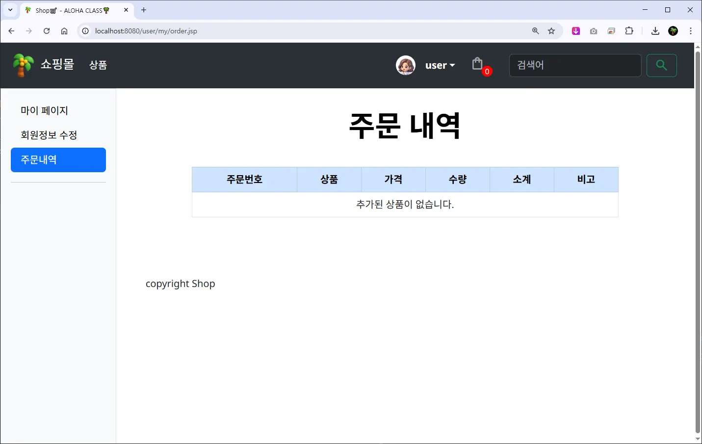 [์ฃผ๋ฌธ๋ด์ญ] ๋ฒํผ์ ๊ตฌํํ๊ณ ํด๋ฆญ ์, ์ฃผ๋ฌธ๋ด์ญ (${ root }/user/my/order.jsp) ํ๋ฉด์ผ๋ก ์ด๋ํ๊ฒ ํ๋ค.