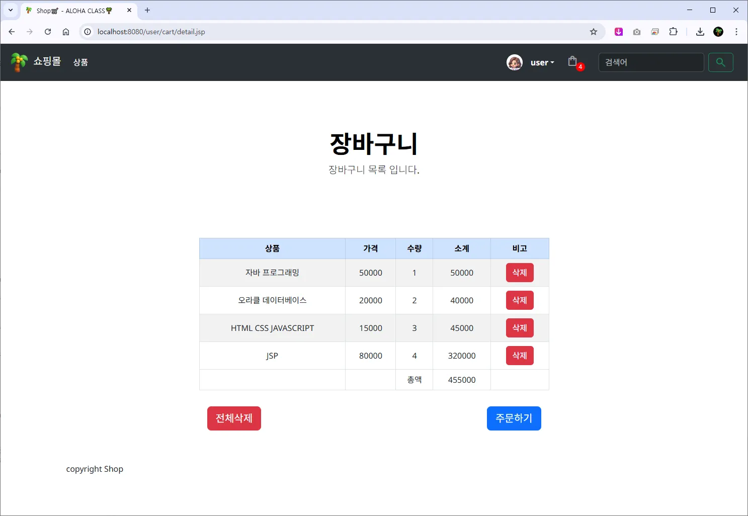 [๋ฑ๋ก] ๋ฒํผ์ ๊ตฌํํ๊ณ ํด๋ฆญ ์, ์ฃผ๋ฌธ ํ์ด์ง (${ root }/user/order/add.jsp) ํ๋ฉด์ผ๋ก ์ด๋ํ๊ฒ ํ๋ค.