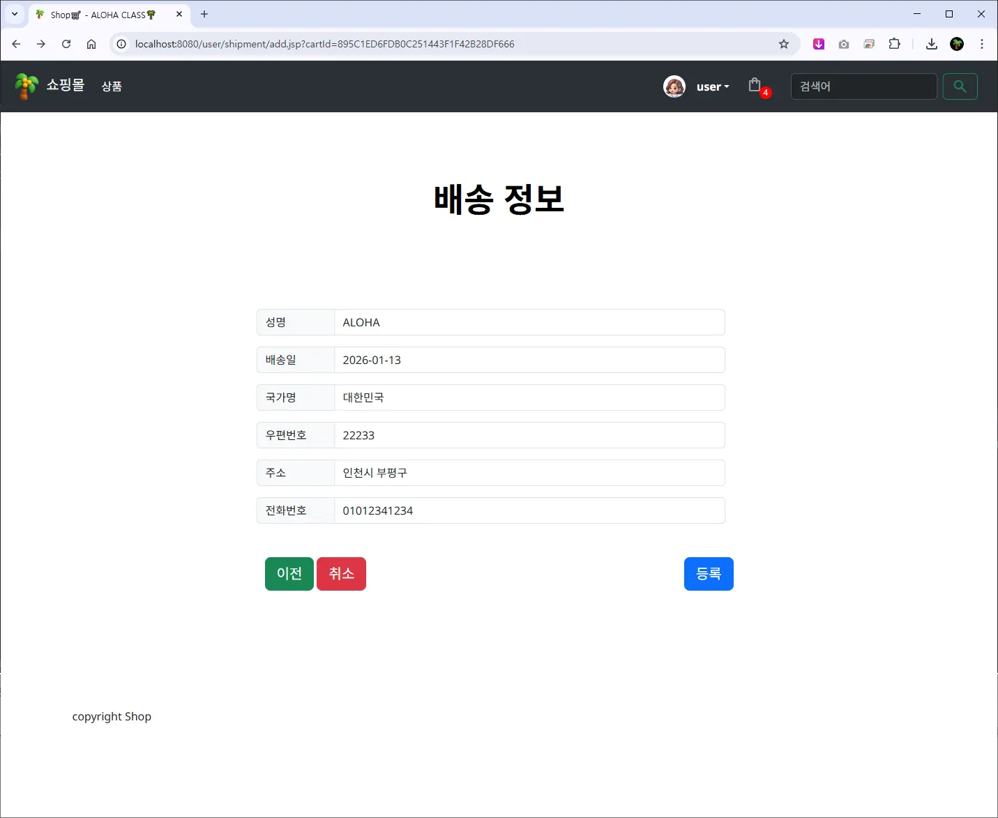[์ฃผ๋ฌธํ๊ธฐ] ๋ฒํผ์ ๊ตฌํํ๊ณ ํด๋ฆญ ์, ๋ฐฐ์ก์ ๋ณด (${ root }/user/shipment/add.jsp) ํ๋ฉด์ผ๋ก ์ด๋ํ๊ฒ ํ๋ค.