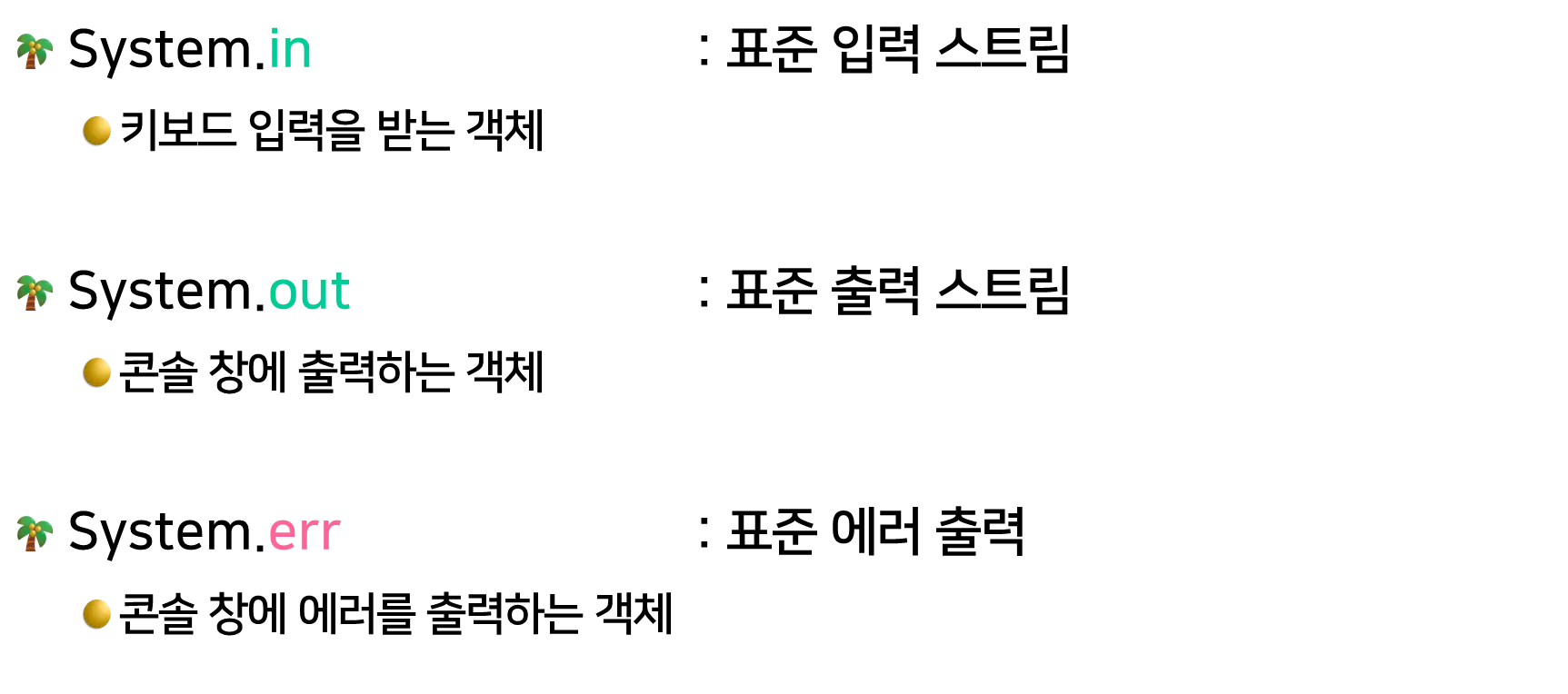 System.out.print( ); | ๋ฐ์ดํฐ๋ฅผ ์ถ๋ ฅํด์ฃผ๋ ๋ฉ์๋ |