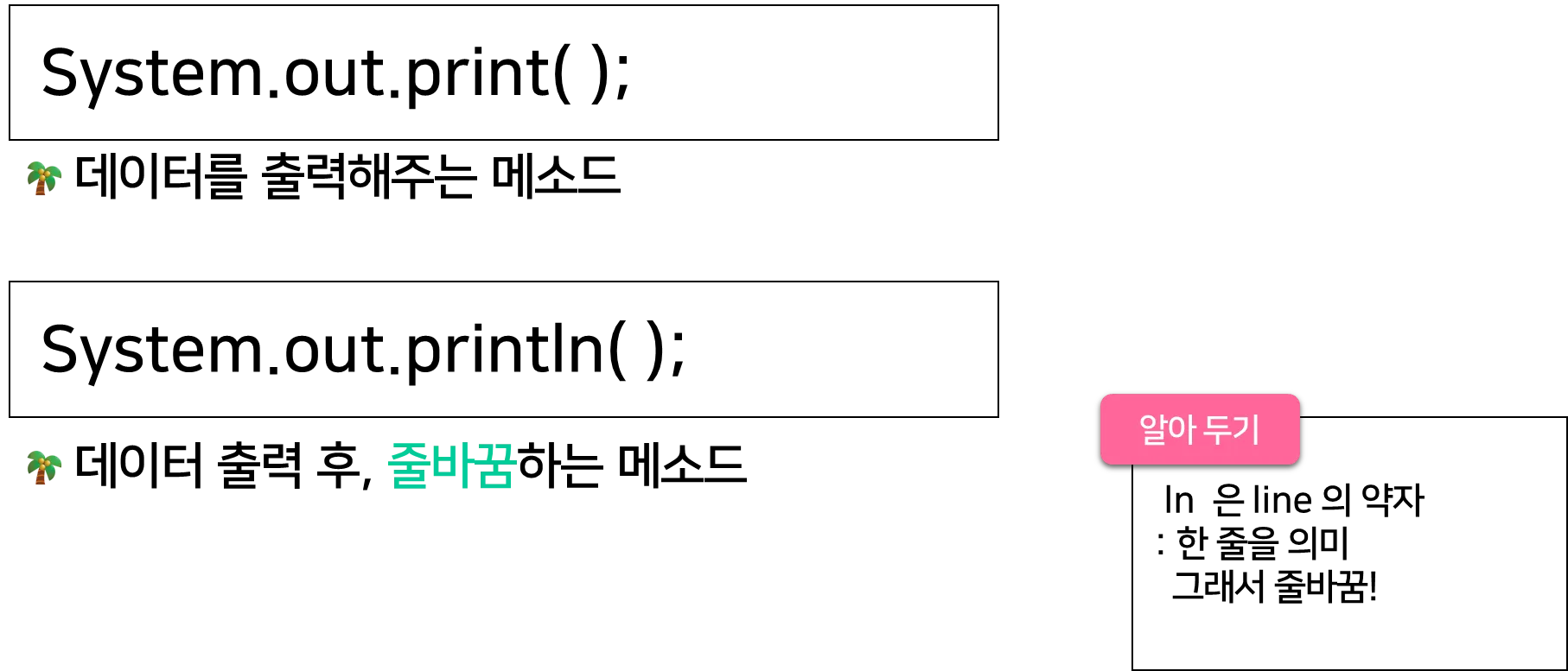 System.out.println( ); | ๋ฐ์ดํฐ ์ถ๋ ฅ ํ, ์ค๋ฐ๊ฟํ๋ ๋ฉ์๋ |