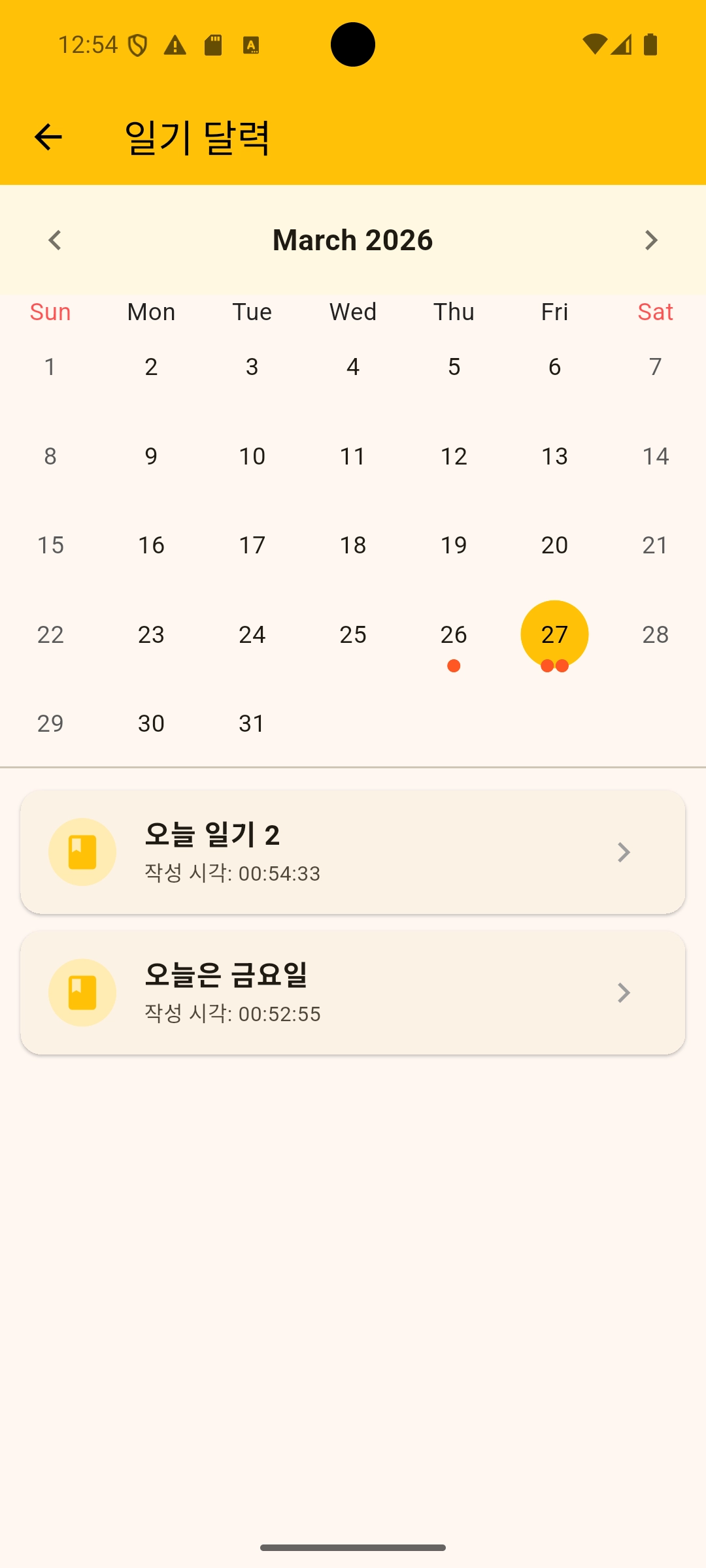 달력 뷰 | 월별 달력 + 일기 있는 날 마커 표시 |