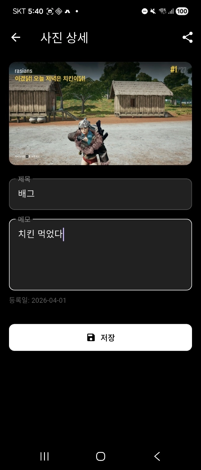 사진 상세 | 전체 이미지 뷰 + 제목·메모 편집 |