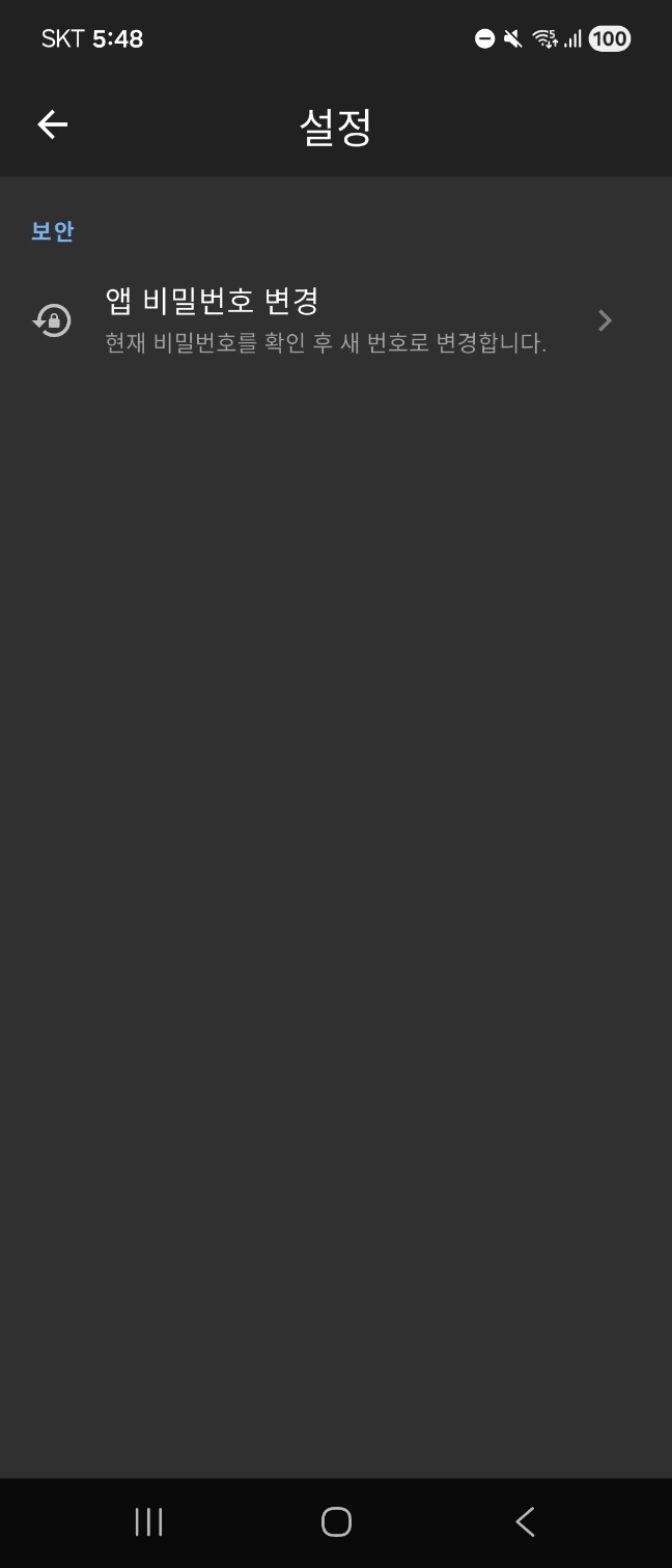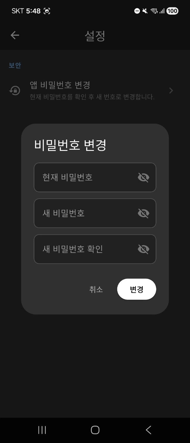 1. 앱 비밀번호 변경: 현재 PW 확인 → 새 PW 입력 → 확인 → setAppPassword()