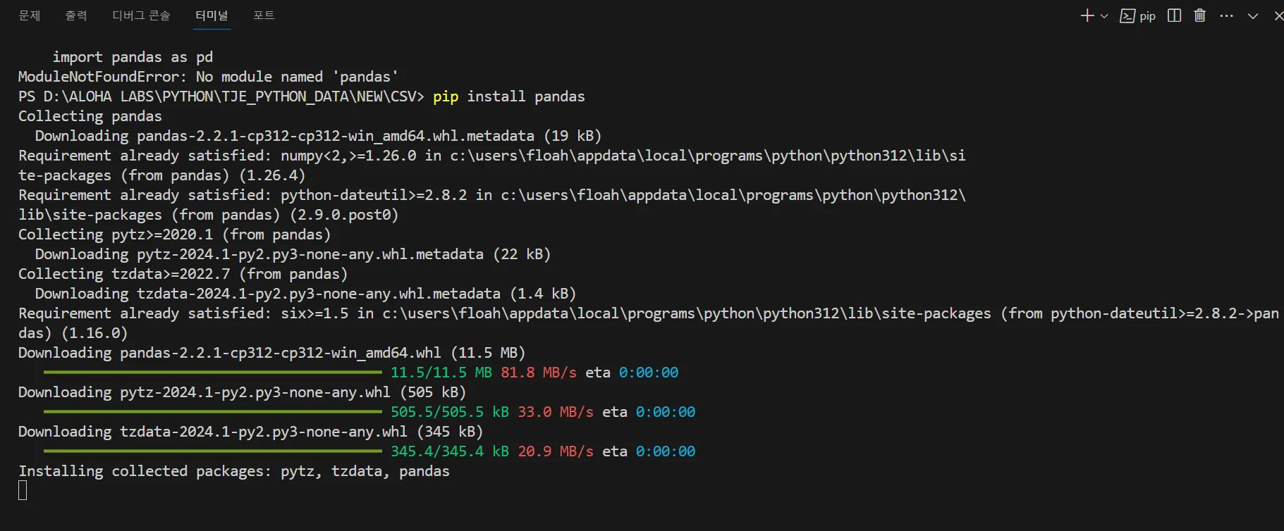 pandas ๋ชจ๋์ด ์ค์น๋์ด ์์ง ์๋ค๋ฉด, ๋ชจ๋ ์ค์น๊ฐ ํ์ํฉ๋๋ค.