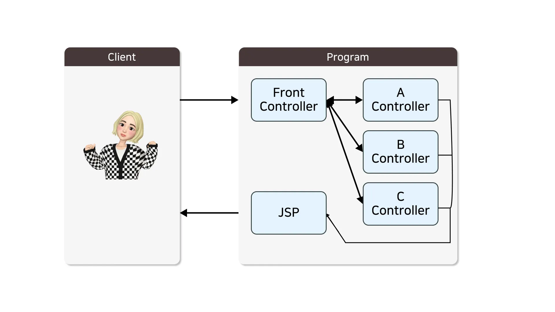 ํด๋ผ์ด์ธํธ๊ฐ ์๋ฒ์ ์์ฒญ์ ํ๋ฉด, Front controller์ธ DispatcherServlet ํด๋์ค๊ฐ ์์ฒญ์ ๋ฐ๋๋ค.