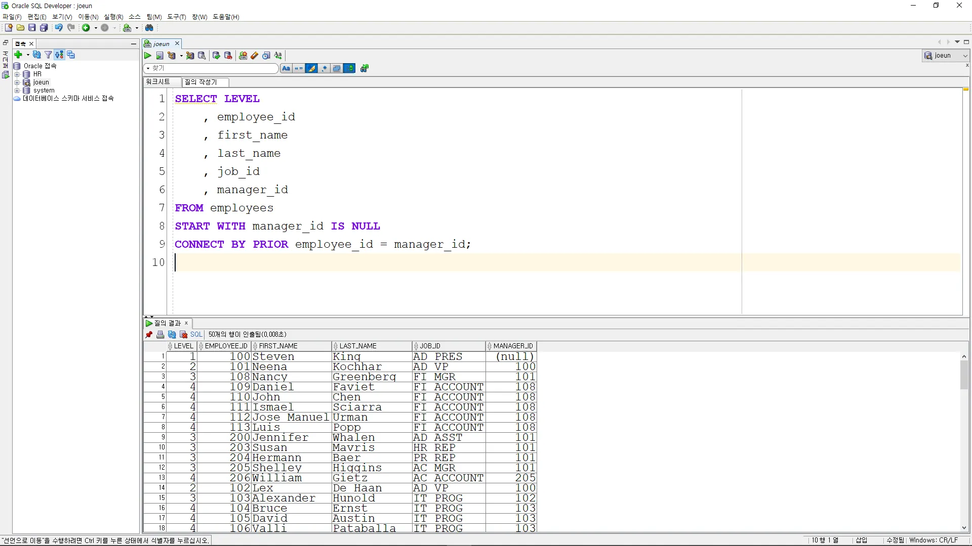 CONNECT BY PRIOR employee_id = manager_id: κ° νμ μ΄μ νκ³Ό μ°κ²°ν©λλ€. μ΄μ ν(PRIOR)μ employee_idκ° νμ¬ νμ manager_idμ κ°μ κ²½μ°, κ³μΈ΅μ μΌλ‘ μ°κ²°λ©λλ€.