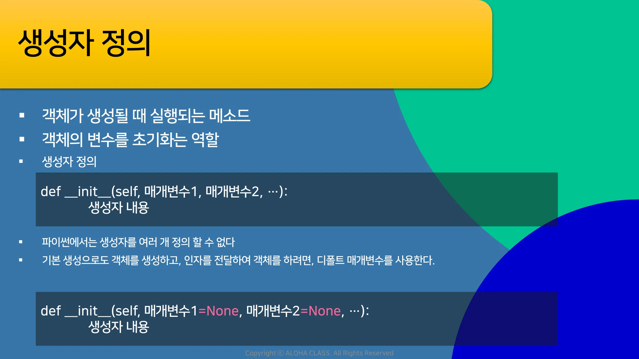 def __init__(self, λ§€κ°λ³μ1, λ§€κ°λ³μ2, ...):