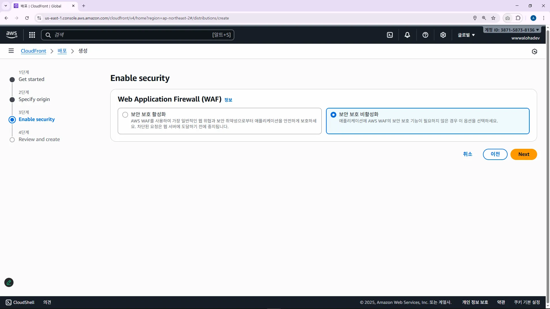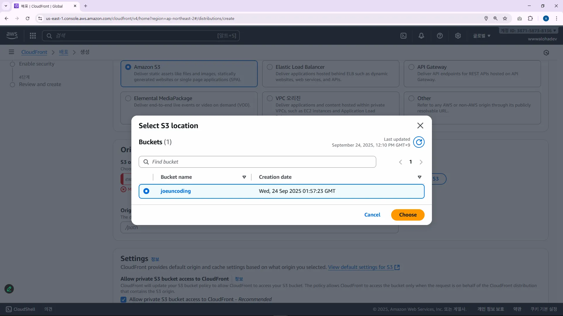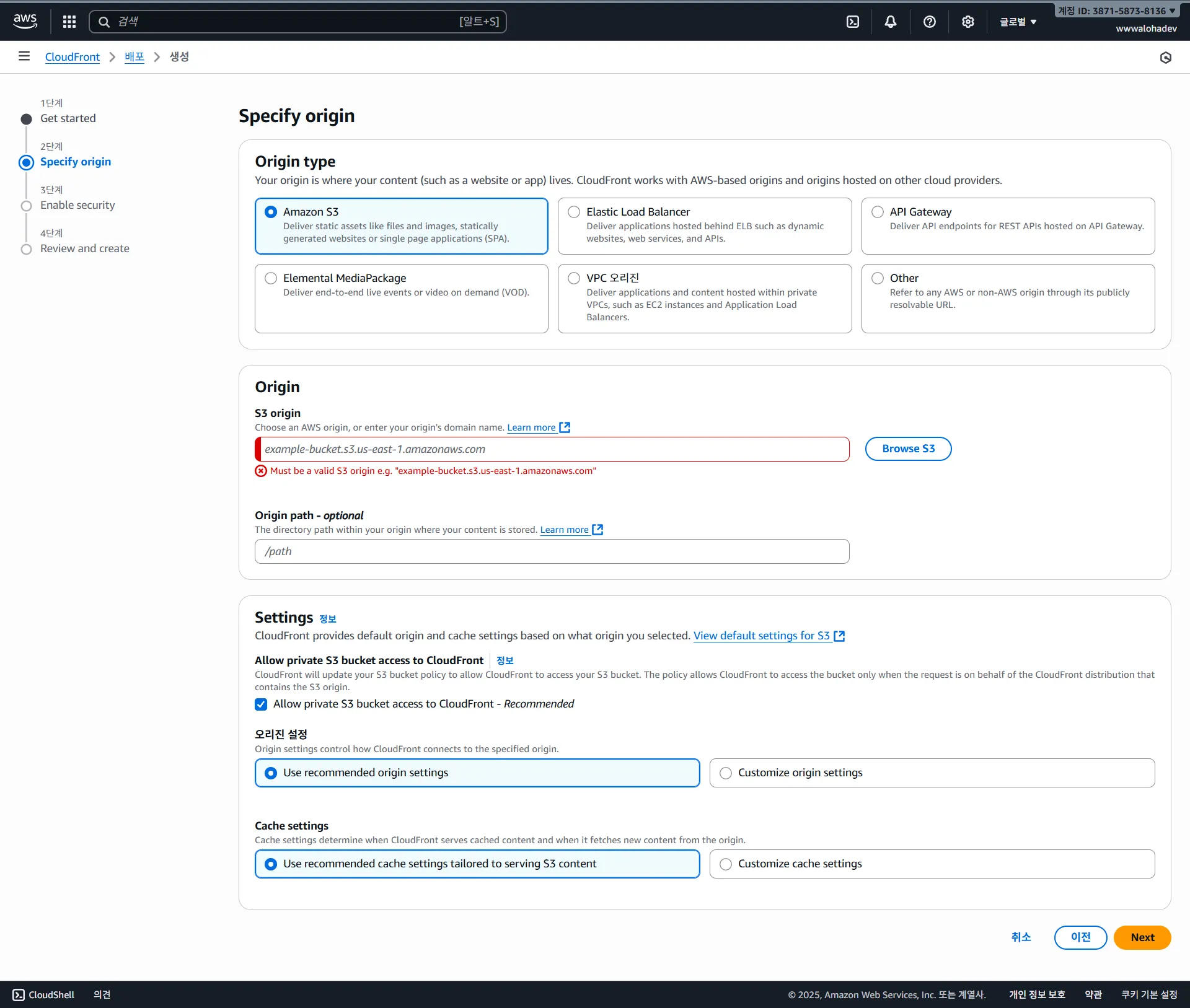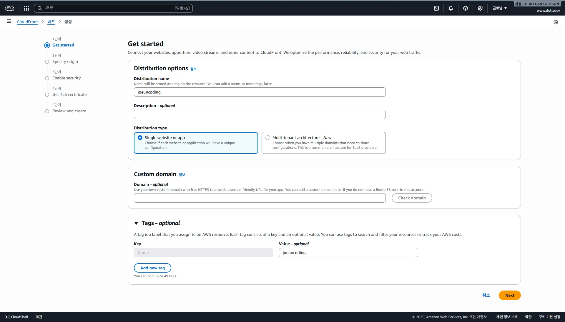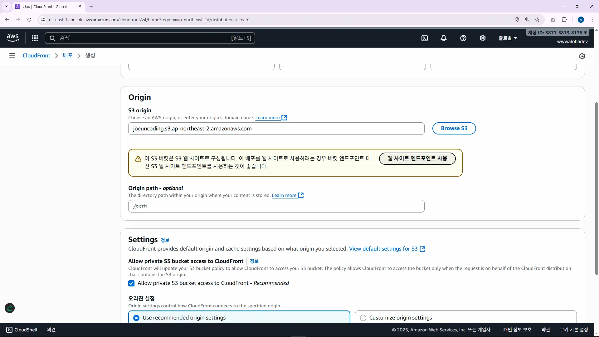 ๋ํ, Cloud Front ๋ฐฐํฌ๋ฅผ ์์ฑํ๋ฉด์ ๋๋ฉ์ธ๊ณผ ์ฐ๊ฒฐํ๋ ์์