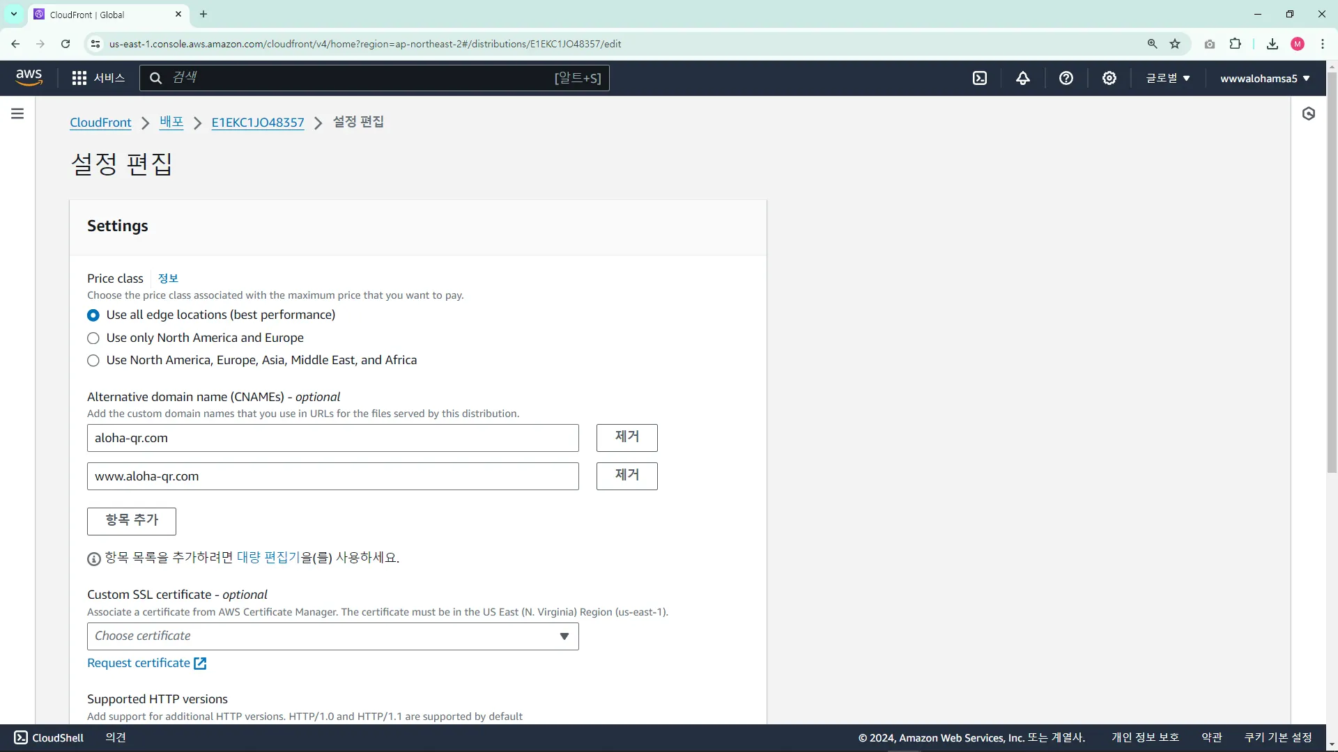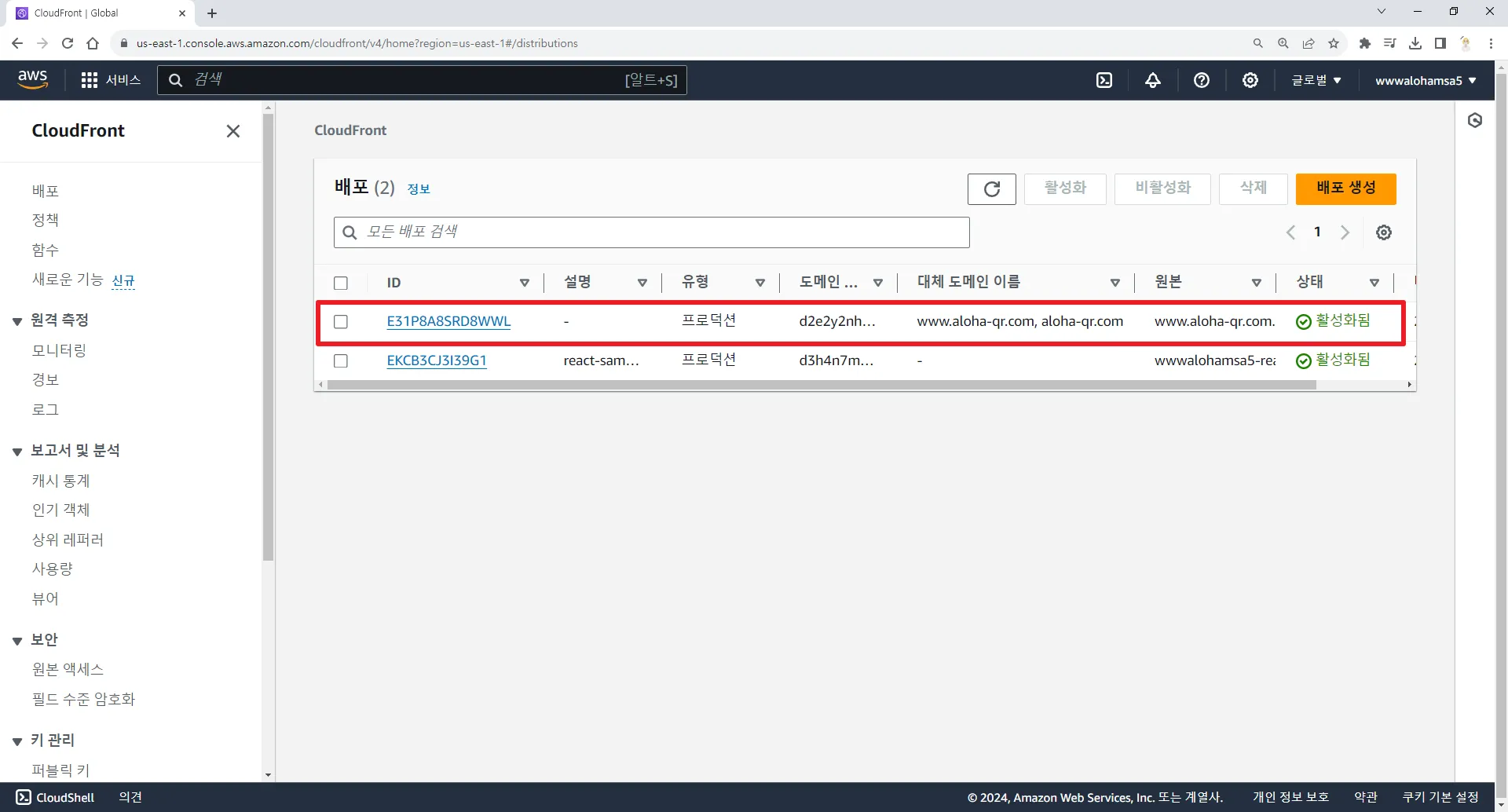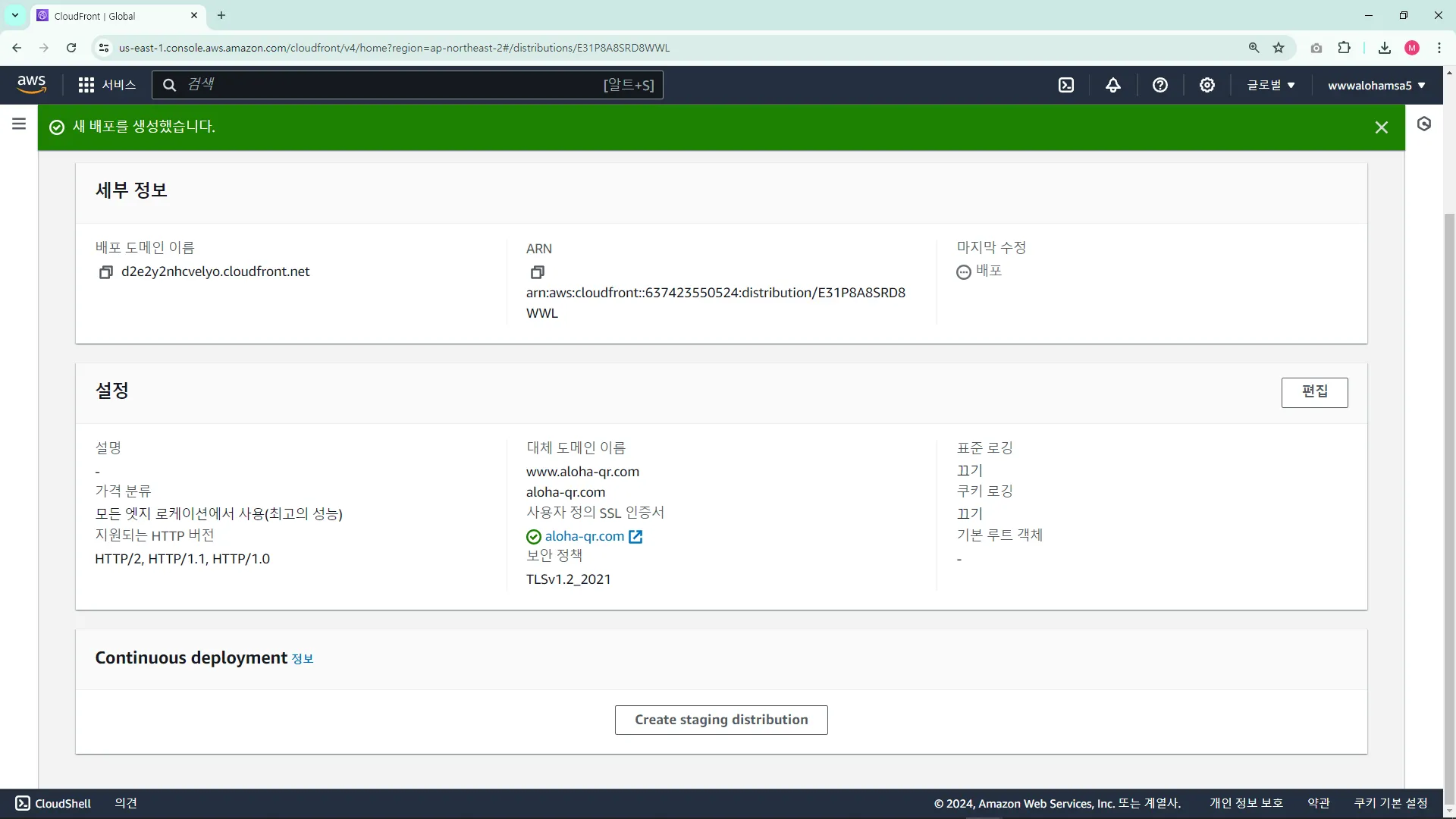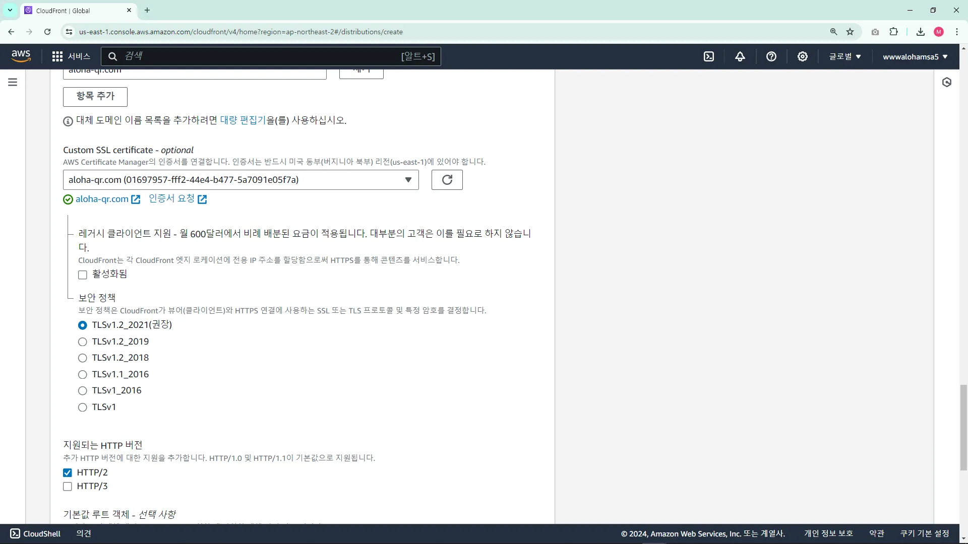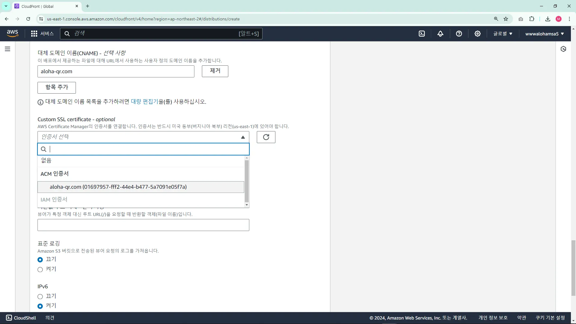 ๋ ์งํํ์์ต๋๋ค. ์ฌ๊ธฐ์๋ aloha-qr.com ์ด๋ผ๋ ๋๋ฉ์ธ๊ณผ Cloud Front ๋๋ฉ์ธ๊ณผ ์ฐ๊ฒฐํ์์ต๋๋ค.