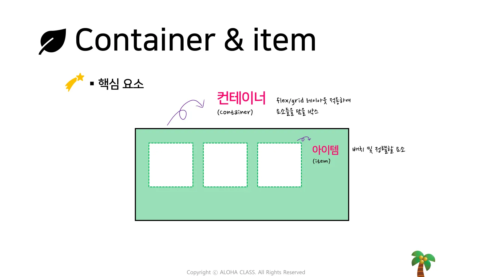 Container 에 담기는 개별 요소들입니다. Item 은 개별적인 정렬 밀 배치 방식을 정의할 수 있습니다.