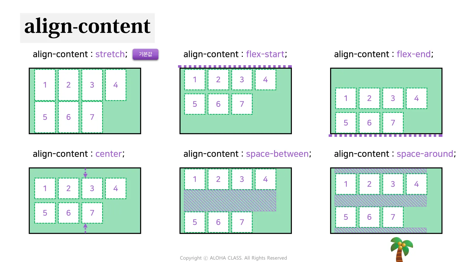 사용 시기: Flex Container가 여러 줄로 아이템을 배치할 때, 줄 사이 간격을 정렬하고 조정하는 데 사용됩니다. 아이템이 단일 줄이면 이 속성은 적용되지 않습니다.