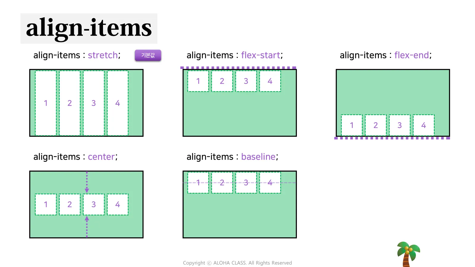 사용 시기: 단일 줄의 아이템들이 교차 축에서 어떻게 정렬될지 설정할 때 사용합니다.