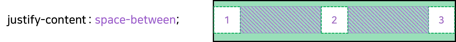 space-between | 시작 Item은 시작점에, 마지막 Item은 끝점에 정렬되고 나머지 Items는 사이에 고르게 정렬됨 |