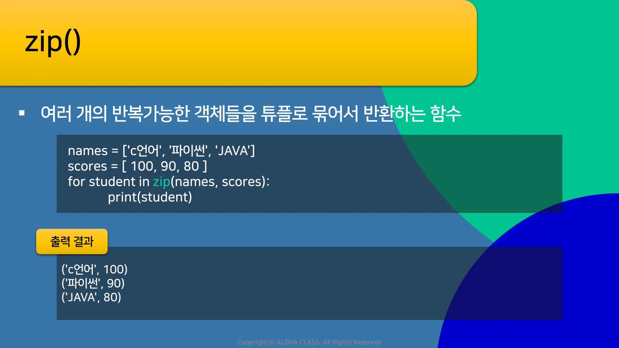 zip() | μ¬λ¬ κ°μ λ°λ³΅κ°λ₯ κ°μ²΄λ₯Ό ννλ‘ λ¬Άμ΄μ λ°ν |