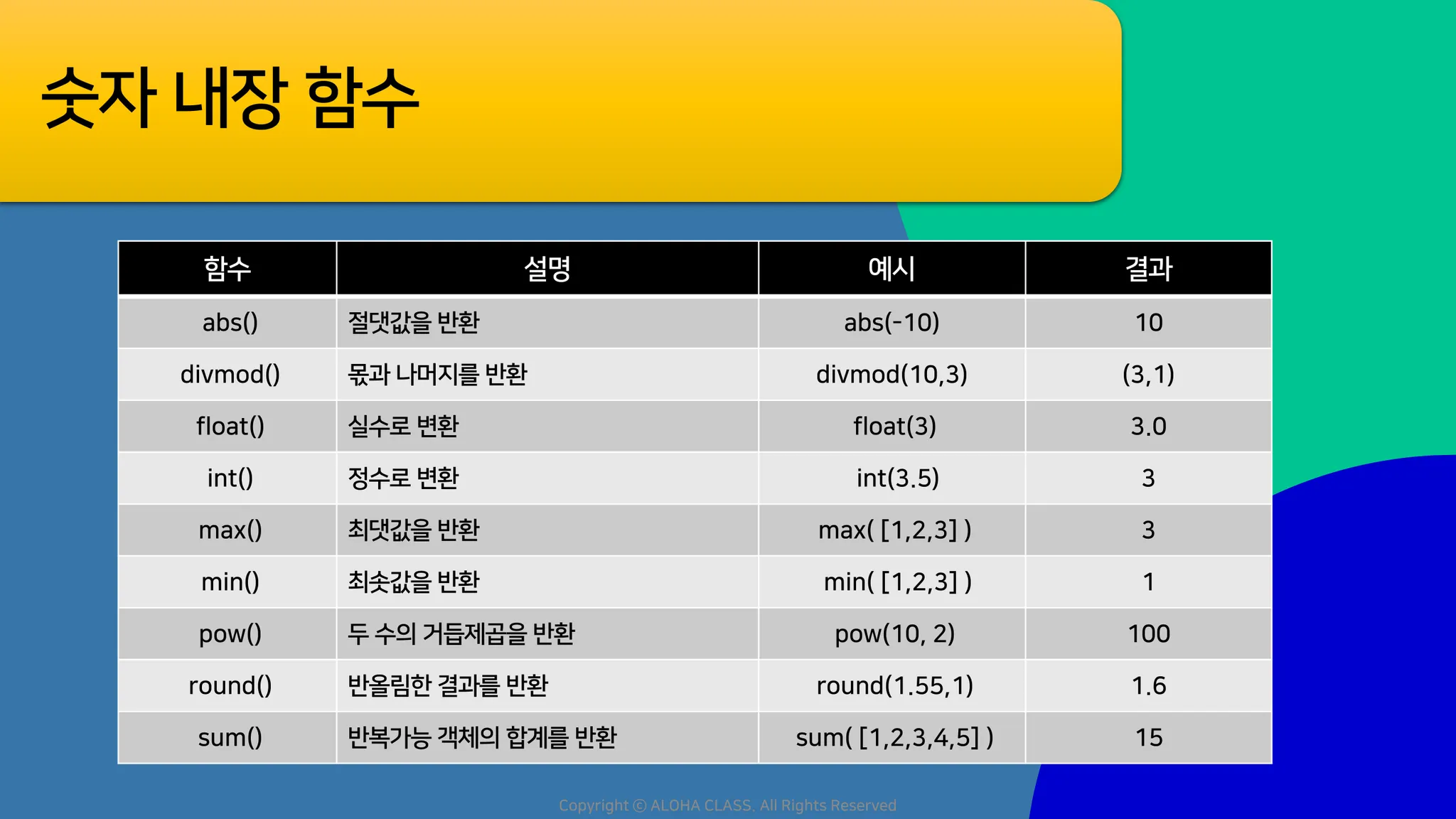μ«μ λ΄μ₯ν¨μ : abs(), max(), min(), pow(), sum() ...