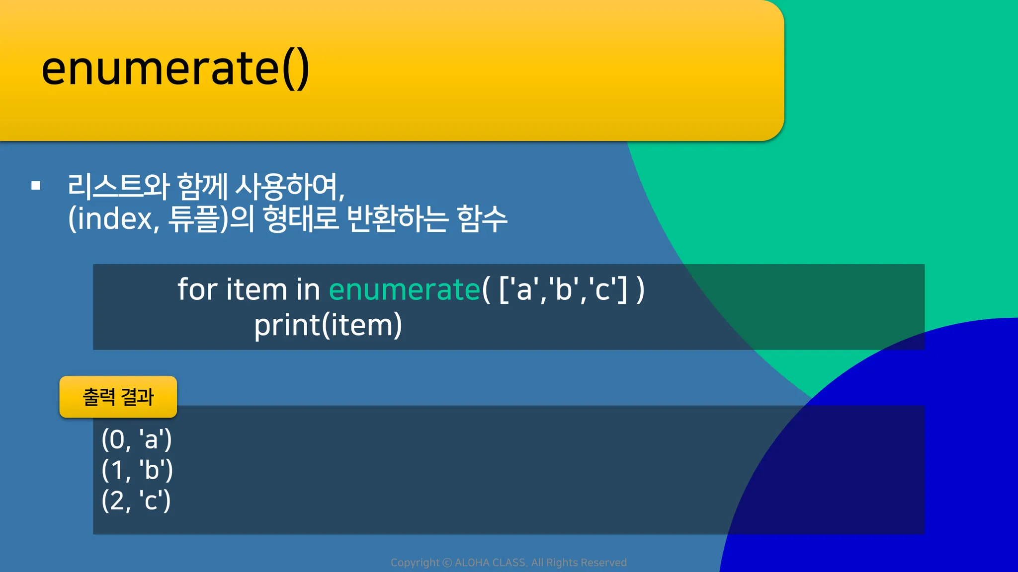 enumerate() | 리μ€νΈμ μμμ μΈλ±μ€λ₯Ό μ§μ μ΄λ£¬ ννλ‘ λ°ν |