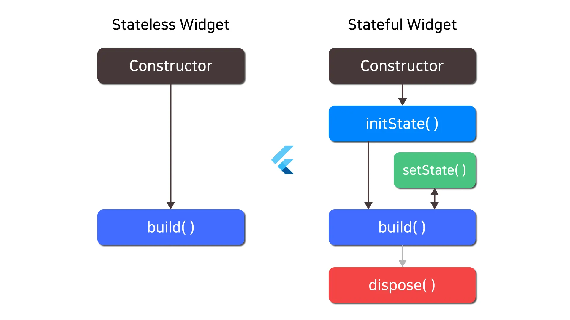 StatefulWidget ์ ์ํ๋ฅผ ์ด๊ธฐํํ๊ธฐ ์ํด, ์ต์ด์ ํ ๋ฒ๋ง ํธ์ถ๋๋ ๋ฉ์๋