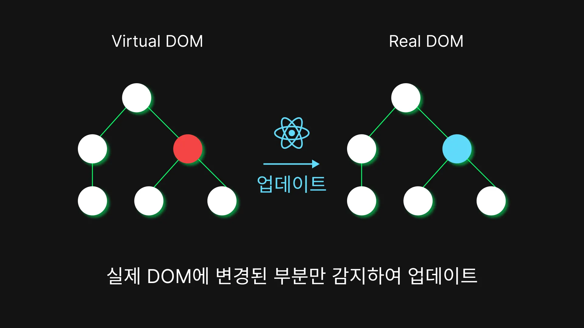 : ๋ณ๊ฒฝ๋ ๋ถ๋ถ์ด ์๋ณ๋๋ฉด React๋ ์ด๋ฅผ ๋ฐํ์ผ๋ก ์ค์ DOM์ ์