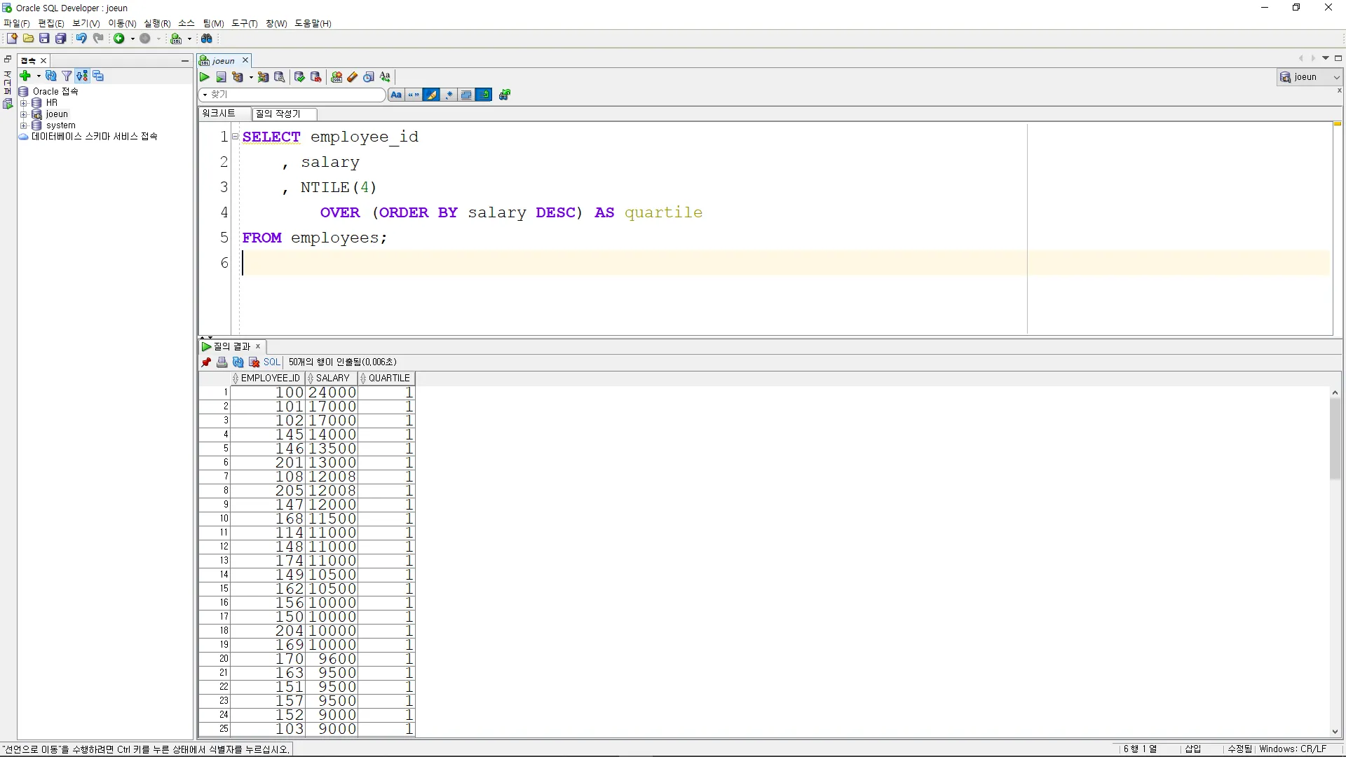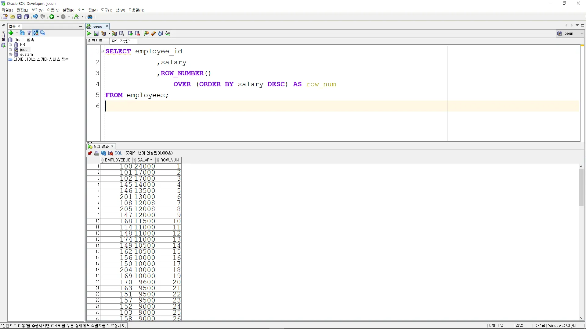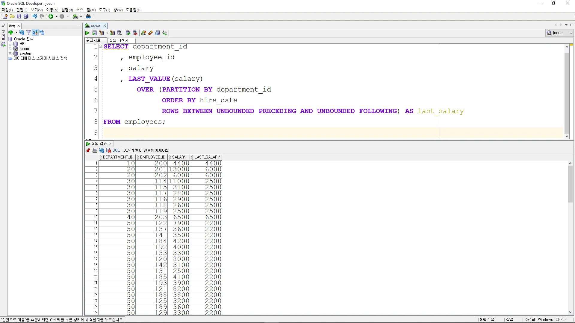 ORDER BY | μ νμ μΌλ‘ μ¬μ©λ©λλ€. μλμ° ν¨μλ₯Ό μ μ©ν λ μ λ ¬ μμλ₯Ό μ§μ ν©λλ€. κΈ°λ³Έμ μΌλ‘ μ λ ¬ μμλ νμ¬ νμ μ€μ¬μΌλ‘ μ μ©λ©λλ€. |