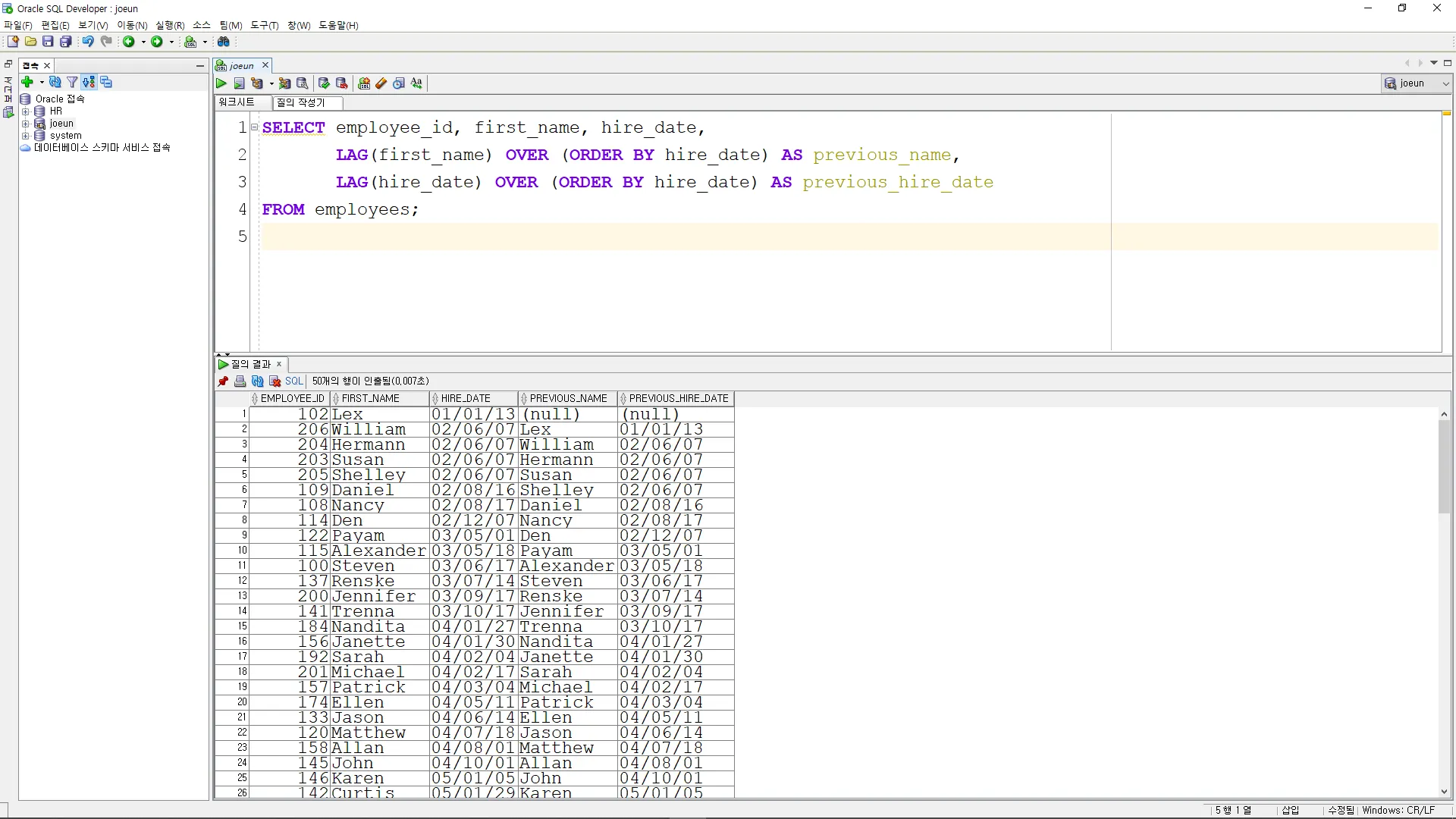 LAG(first_name) OVER (ORDER BY hire_date) AS previous_name,
