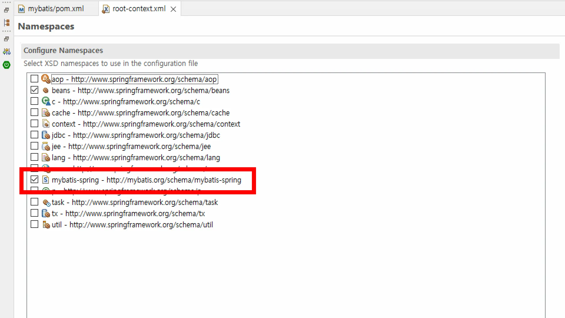 xmlns:mybatis-spring="http://mybatis.org/schema/mybatis-spring"