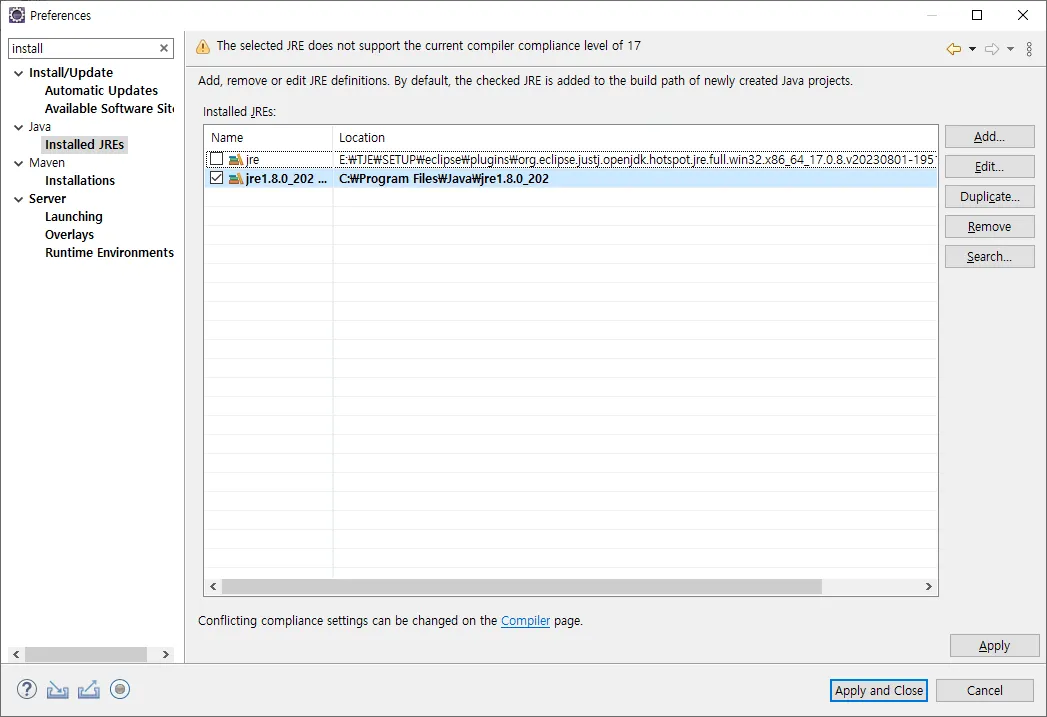 [Java] > [Installed JREs]