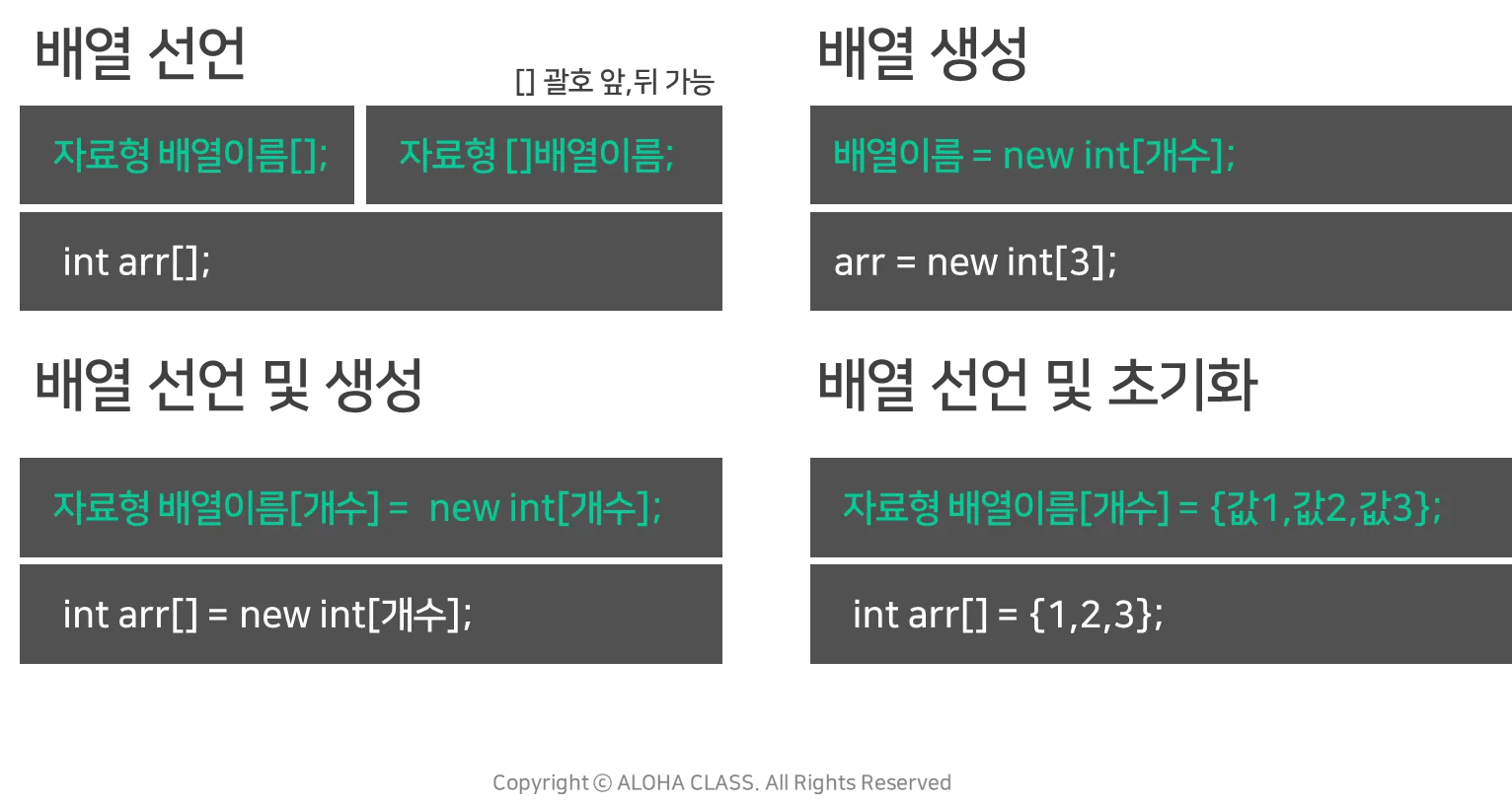 배열 선언과 생성을 따로따로 하지 않고 한 번에 할 수 있습니다.