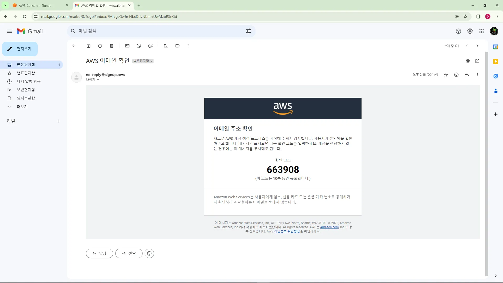 AWS ์ ๊ฒฝ์ฐ ํ์ํํด๋ฅผ ํ๋ฉด ํด๋น ์ด๋ฉ์ผ๋ก๋ ์๊ตฌ์ ์ผ๋ก ๋ค์ ๊ฐ์