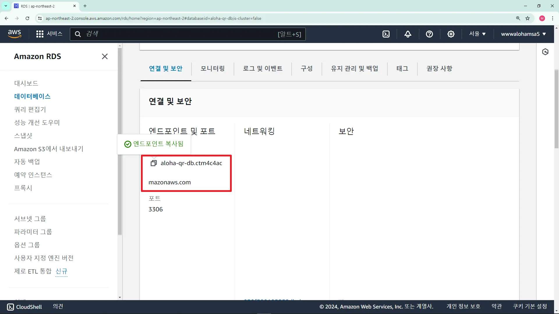 URL : RDS ์๋ํฌ์ธํธ (aloha-aws-db.xxxxxxxx.com:3306)