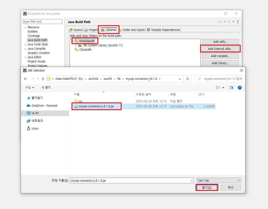 [Libraries ํญ] > [Add JARsโฆ] or [Add External JARsโฆ]