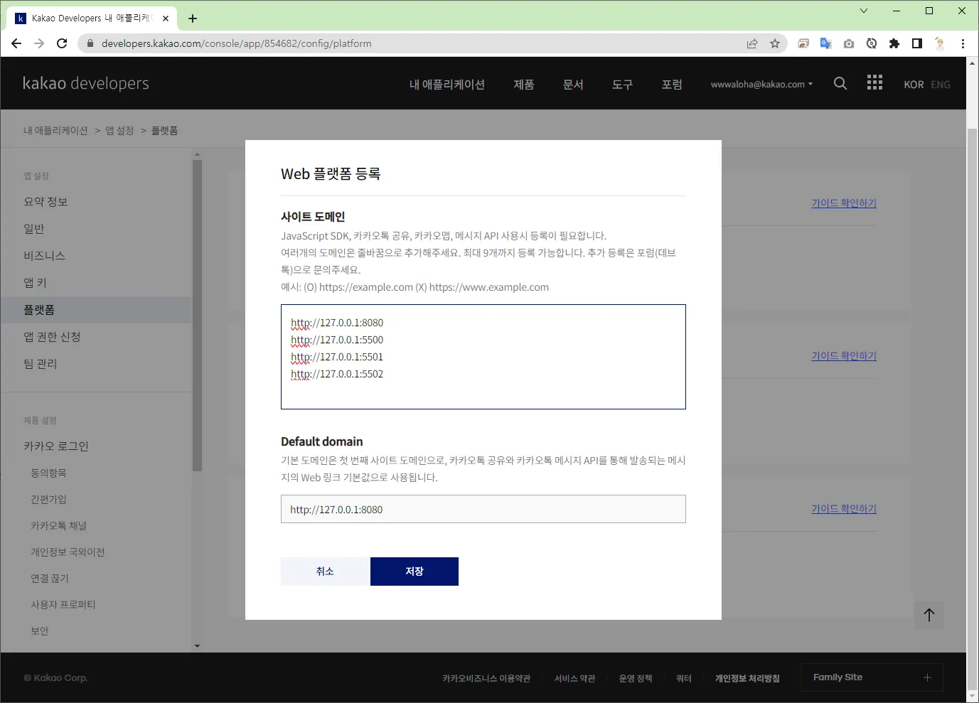 Default domain ์ ๋ ฅ : http://127.0.0.1:8080