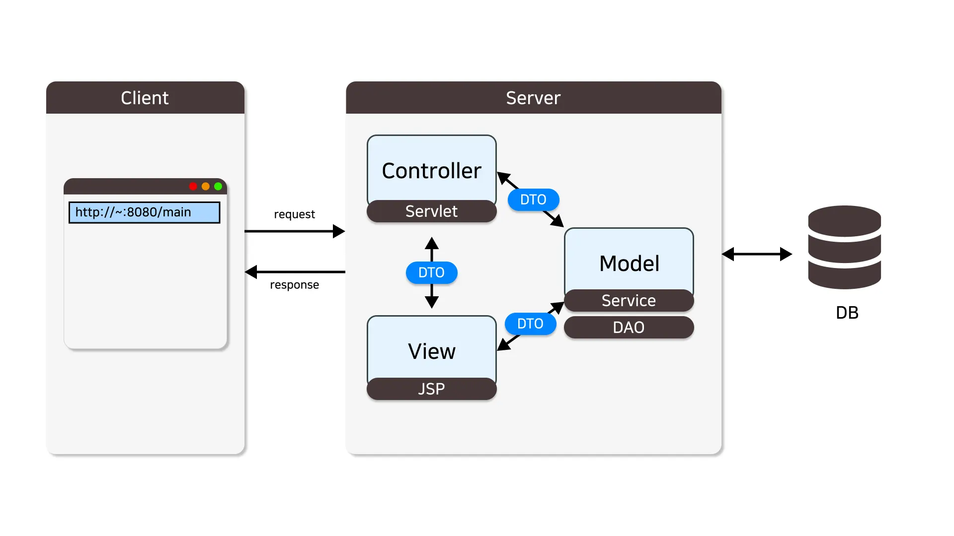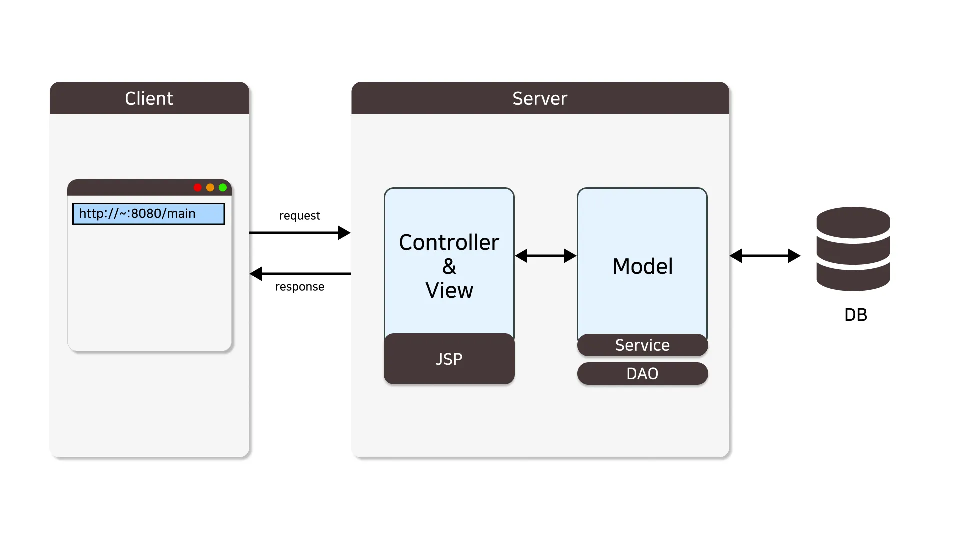 ์์ ์์ฒญ์ด JSP๋ก ์ง์ ์ ๋ฌ๋๊ณ , JSP์์ ๋ฐ์ดํฐ ์ฒ๋ฆฌ์ ๋ทฐ๋ฅผ ๋์์ ๋ด๋น.