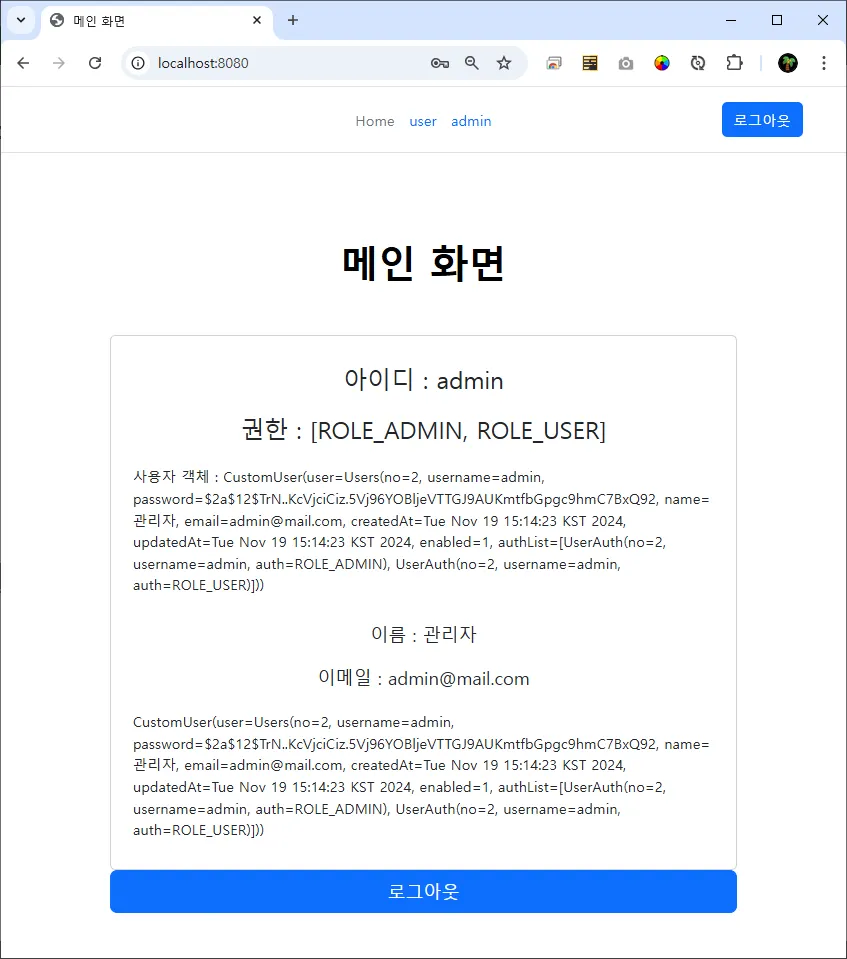 <p>κΆν λͺ©λ‘: <span sec:authentication="authorities"></span></p>