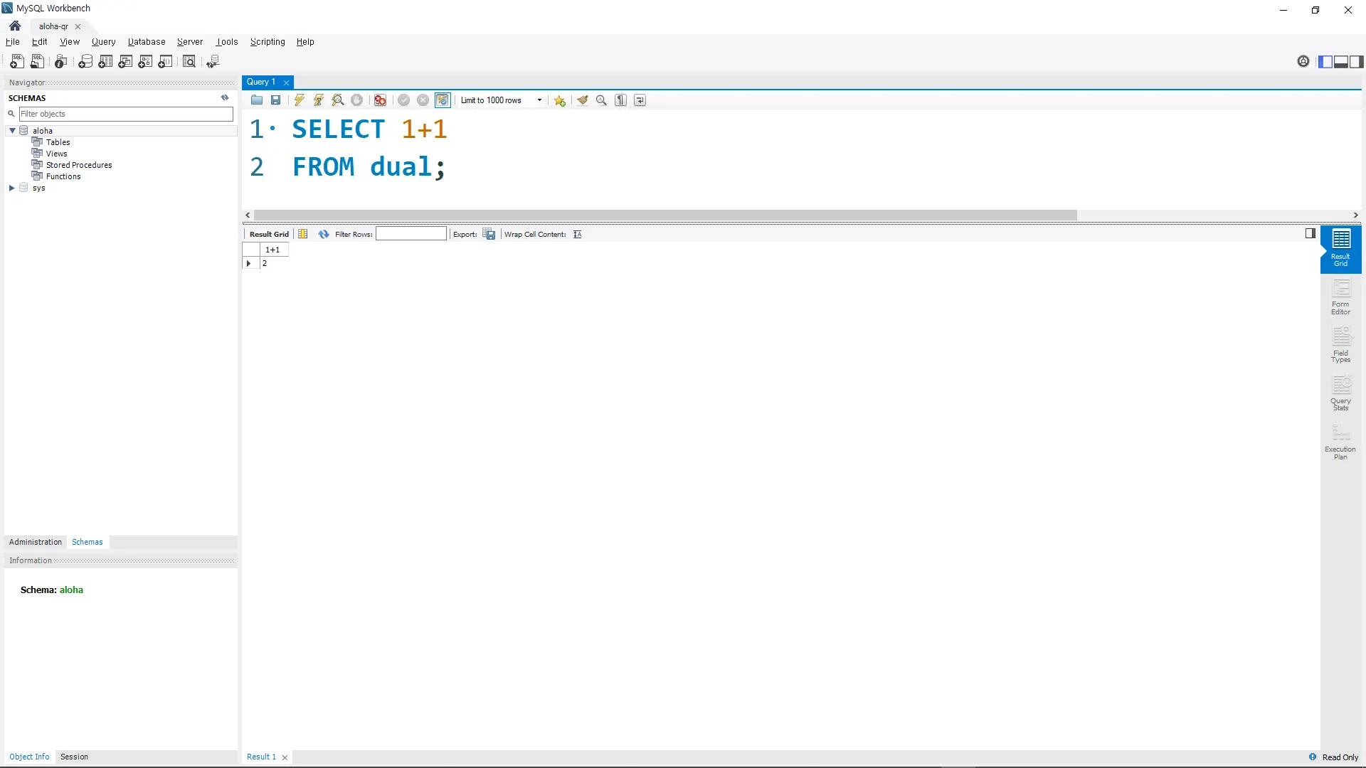 ์ฌ๊ธฐ์๋ โalohaโ ๋ผ๋ ์ด๊ธฐ ๋ฐ์ดํฐ๋ฒ ์ด์ค(์คํค๋ง)๋ฅผ ์ง์ ํ๋ค.